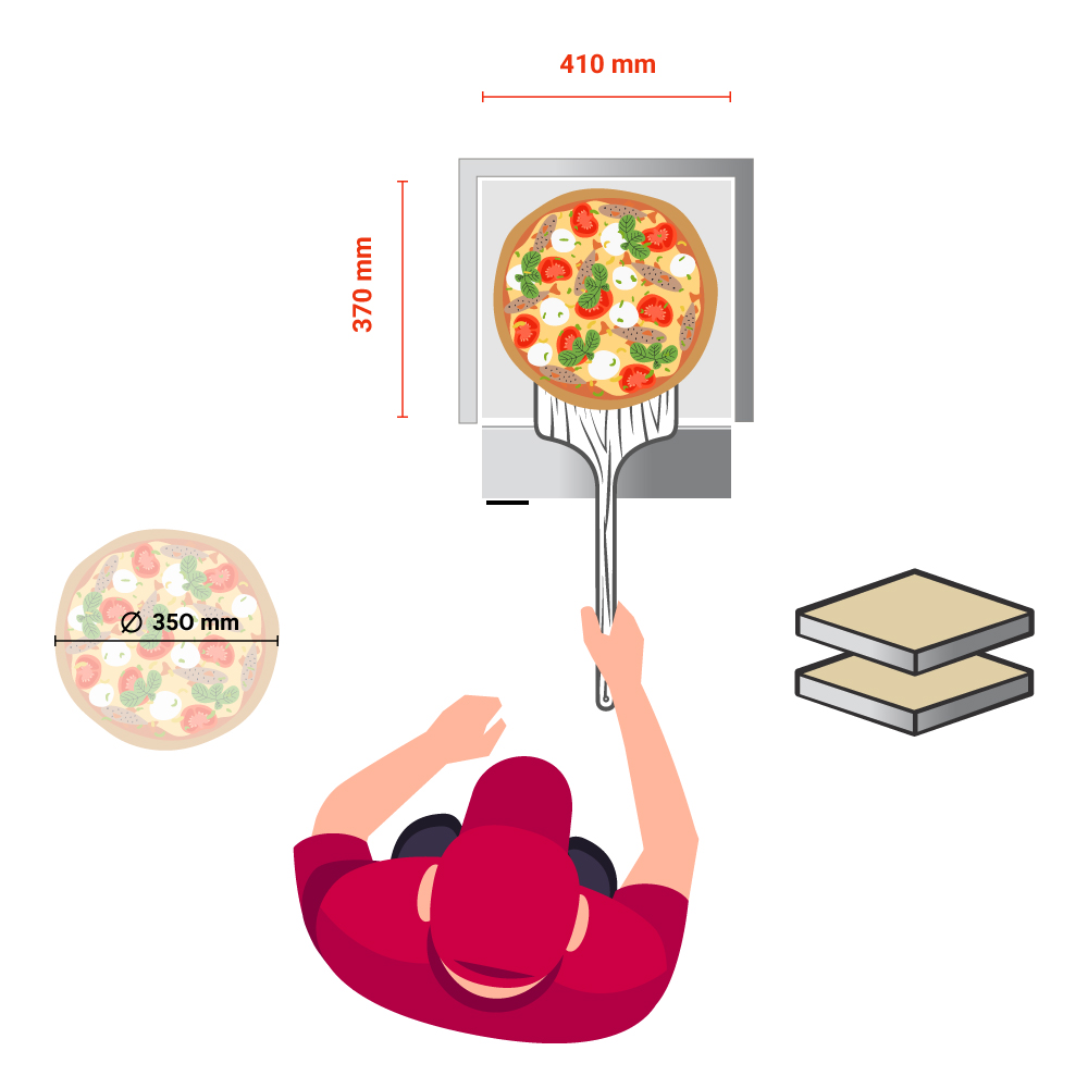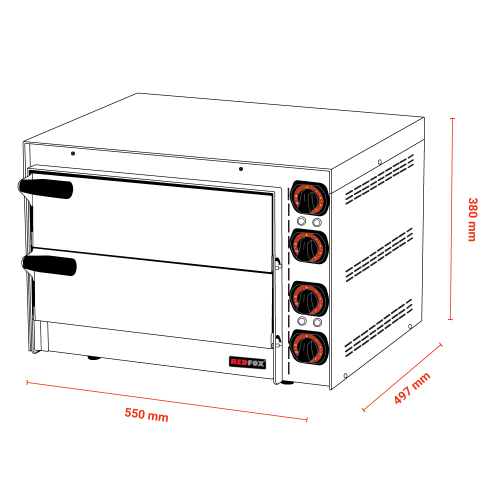 'Διαστάσεις 550x497x380(h)mm Διαστάσεις θαλάμου 2 x [410x370x90(h)mm] Ισχύς 3000 Watt, 230V / 50Hz Θερμοκρασία 50ºC - 300ºC Χρονοδιακόπτης έως 15'' Διάμετρος πίτσας 2 x Ø 35cm Βάρος 28,7 kg Κωδικός προμηθευτή 104 200 020 Πυρίμαχη πλάκα 2 θερμοστάτες (1 σε κάθε θάλαμο)'