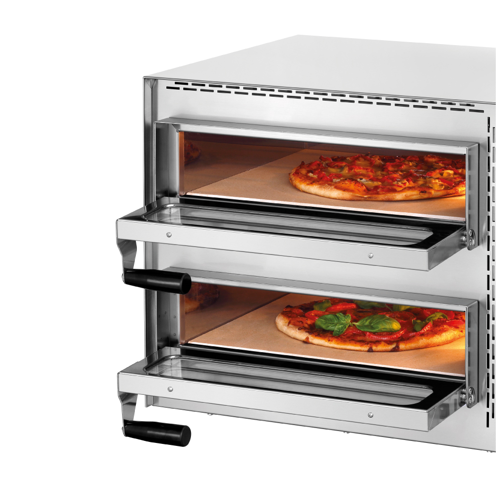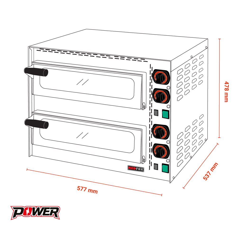 Διαστάσεις 577x537x478(h)mm Διαστάσεις θαλάμου 2 x [410x370x90(h)mm] Ισχύς 3400 Watt, 230V / 50Hz Θερμοστάτης 50ºC - 400ºC Διάμετρος πίτσας 2 x Ø 35cm Βάρος 37,8 kg Κωδικός προμηθευτή 104 200 115 Πυρίμαχη πλάκα κάτω 2 θερμοστάτες σε κάθε θάλαμο ρυθμιζόμενοι για κάθε αντίσταση ξεχωριστά Εσωτερικός φωτισμός Πόρτες με τζάμι