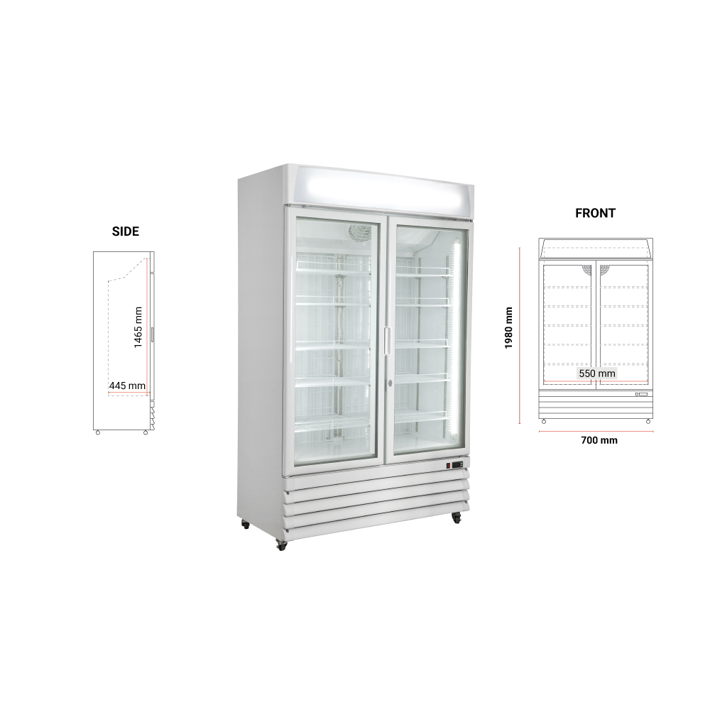 Εξωτερικές διαστάσεις 1220x700x1980(h)mm Εσωτερικές διαστάσεις 1100x445x1465(h)mm Χωρητικότητα 1240 lt Θερμοκρασία -22ºC / -18ºC Ισχύς 1150Watt / 220-240V / 50Hz Ψύξη Βεβιασμένη Απόψυξη Αυτόματη(Hot Gas) + Χειροκίνητη Ψυκτικό υγρό R290 Ράφια 10 (605x410mm) Φωτισμός LED Κλιματική κλάση 7 (+35°C & 75%RH) Βάρος 228 kg 2 ανοιγόμενες πόρτες με αυτόματη επαναφορά & κλειδαριά Ηλεκτρονικός θερμοστάτης - θερμόμετρο 4 ροδάκια (τα δύο με φρένο)