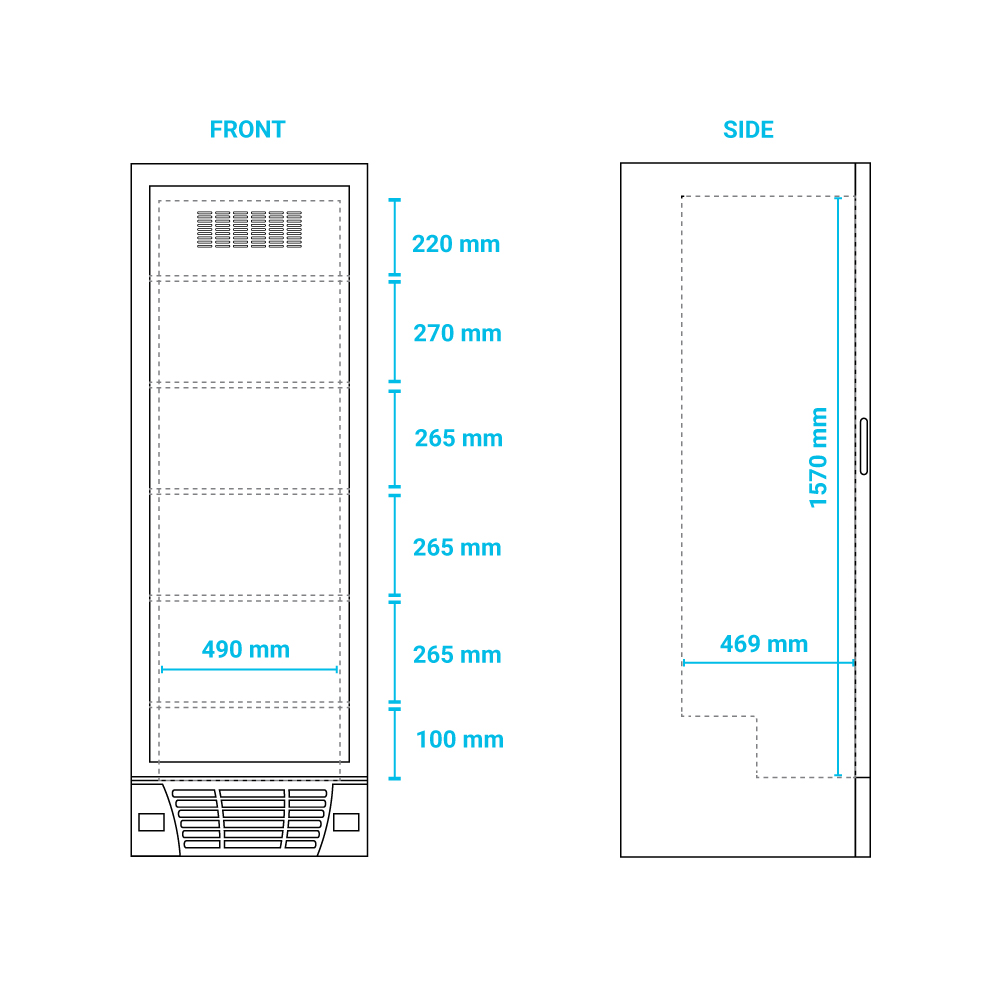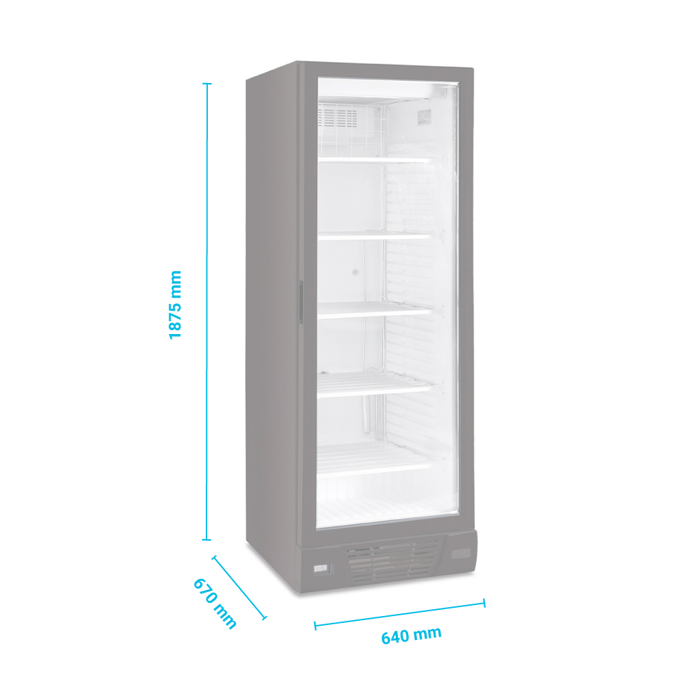 Εξωτερικές διαστάσεις 640x670x1875(h)mm Εσωτερικές διαστάσεις 490x469x1570(h)mm Χωρητικότητα 382 lt Θερμοκρασία -24º / -18ºC Ισχύς 598Watt / 220-240V / 50Hz Ψύξη Yποβοηθούμενη με ανεμιστήρα Απόψυξη Χειροκίνητη Ψυκτικό υγρό R404A / R290 Ράφια 5 (488x392mm) Φωτισμός LED Κλιματική κλάση 4 (+30ºC & 55%RH) Βάρος 106 Kg Μηχανικός θερμοστάτης - αναλογικό θερμόμετρο 2 ρυθμιζόμενα ποδαράκια & 2 ροδάκια