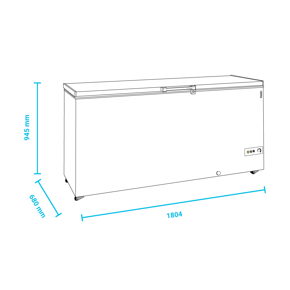 Εξωτερικές διαστάσεις 1804x680x945(h)mm Εσωτερικές διαστάσεις 1680x480x725(h)mm Θερμοκρασία -14 / -24 οC Ισχύς 250 Watt, 220-240V / 50Hz Χωρητικότητα 567 lt Ψύξη Στατική Απόψυξη Χειροκίνητη Ψυκτικό υγρό R600a Κλιματική κλάση 4 (30°C & 55%RH) Φωτισμός Εσωτερικός Καθαρό Βάρος 114 Κg ΙNOX καπάκι Μηχανικός θερμοστάτης -θερμόμετρο Με κλειδαριά 4 διπλά ροδάκια