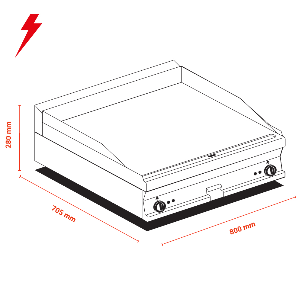 Διαστάσεις 800x705x280(h)mm Επιφάνεια ψησίματος 760x510mm Ισχύς 11,1Kw/400V/50-60Hz Βάρος 103 kg Κωδικός Προϊόντος 18060834 Ρυθμιζόμενα ποδαράκια