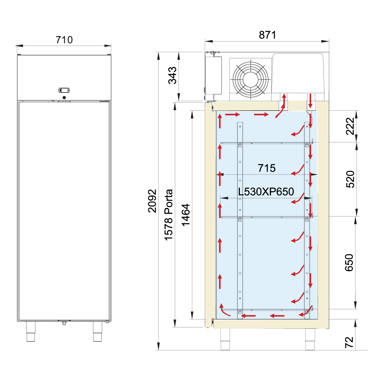 Διαστάσεις 720x850x2050(h)mm Χωρητικότητα 620 lt Ισχύς 500 Watt, 230V / 50Hz Θερμοκρασία (TN):-2 / +8ºC (TB):-15 / -18oC Ψύξη Βεβιασμένη Απόψυξη Αυτόματη (με αντιστάσεις) Ψυκτικό υγρό R452a Κλιματική κλάση 4 (+30oC & 55%RH) Ράφια 3 (πλαστικοποιημένα) Κατασκευή ΙΝΟΧ εσωτερικά - εξωτερικά 4 ρόδες πολλαπλής κατεύθυνσης (οι 2 με φρένο) Ηλεκτρονικός πίνακας λειτουργιών Πόρτα με κλειδαριά και σύστημα επαναφοράς