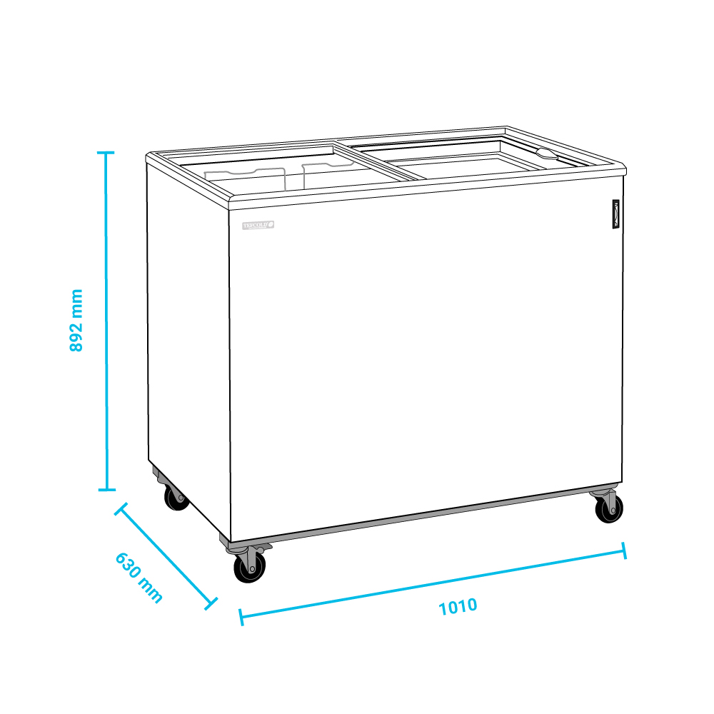 Εξωτερικές διαστάσεις 1010x630x892(h)mm Εσωτερικές διαστάσεις 890x510x655(h)mm Χωρητικότητα 296 lt Θερμοκρασία -24ºC / -14ºC Ισχύς 119Watt / 220-240V / 50Hz Ψύξη Στατική Απόψυξη Χειροκίνητη Ψυκτικό υγρό R290 Καθαρό Βάρος 55 Kg Αναλογικό θερμόμετρο-Μηχανικός θερμοστάτης Κλειδαριά 4 ρόδες πολλαπλής κατεύθυνσης (οι δύο με φρένο)