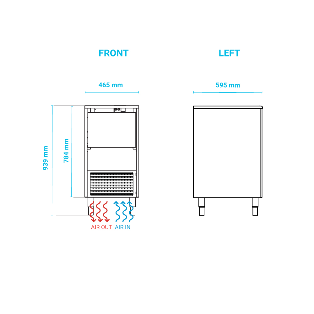 Διαστάσεις 465x595x784*(h)mm Παραγωγή σε 24h αερόψυκτη 66* Kg Ισχύς 679 Watt, 230V / 50Hz Αποθήκη 20 Kg Ψυκτικό υγρό R290a Καθαρό Βάρος 55 Kg *Με έξτρα πόδια : 889 / 939 mm *Θερμοκρασία περιβάλλοντος / νερού : 10°C