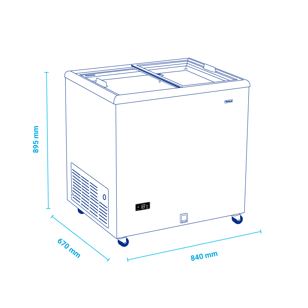 Εξωτερικές διαστάσεις 840x670x895(h)mm Χωρητικότητα 222 lt Θερμοκρασία -22ºC / -9ºC Ισχύς 115Watt / 220-240 V/ 50 Hz Ψύξη Στατική Απόψυξη Χειροκίνητη Ψυκτικό υγρό R600a Κλιματική κλάση 4 (30°C & 55%RH) Βάρος 48 Kg Προδιαγραφές Tropical Κλειδαριά 4 Ρόδες πολλαπλής κατεύθυνσης