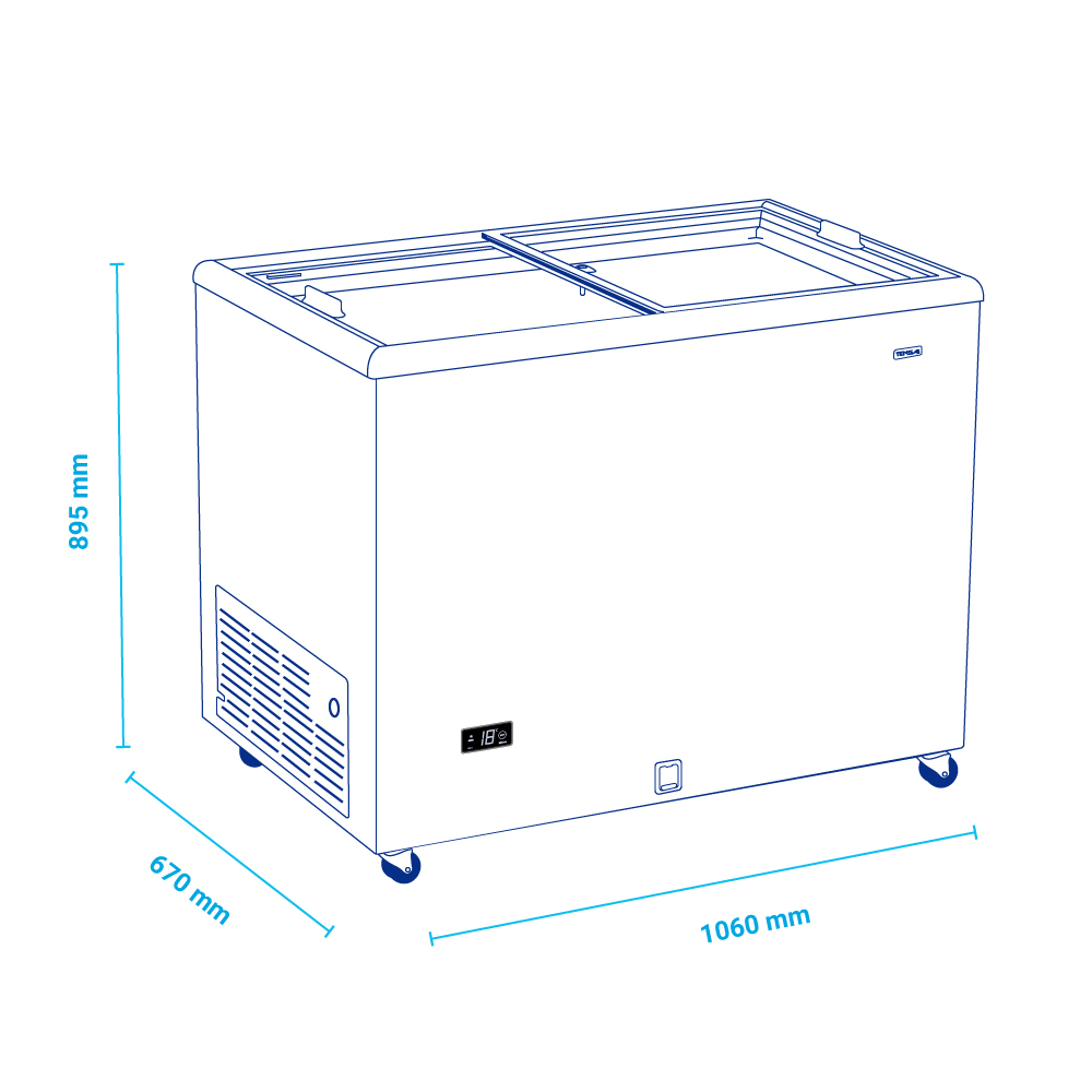 Εξωτερικές διαστάσεις 1060x670x895(h)mm Θερμοκρασία -22ºC / -9ºC Χωρητικότητα 304 lt Ισχύς 135Watt / 220-240 V / 50 Hz Ψύξη Στατική Απόψυξη Χειροκίνητη Ψυκτικό υγρό R600a Κλιματική κλάση 4 (30°C & 55%RH) Βάρος 54 Kg Προδιαγραφές Tropical Κλειδαριά 4 Ρόδες πολλαπλής κατεύθυνσης