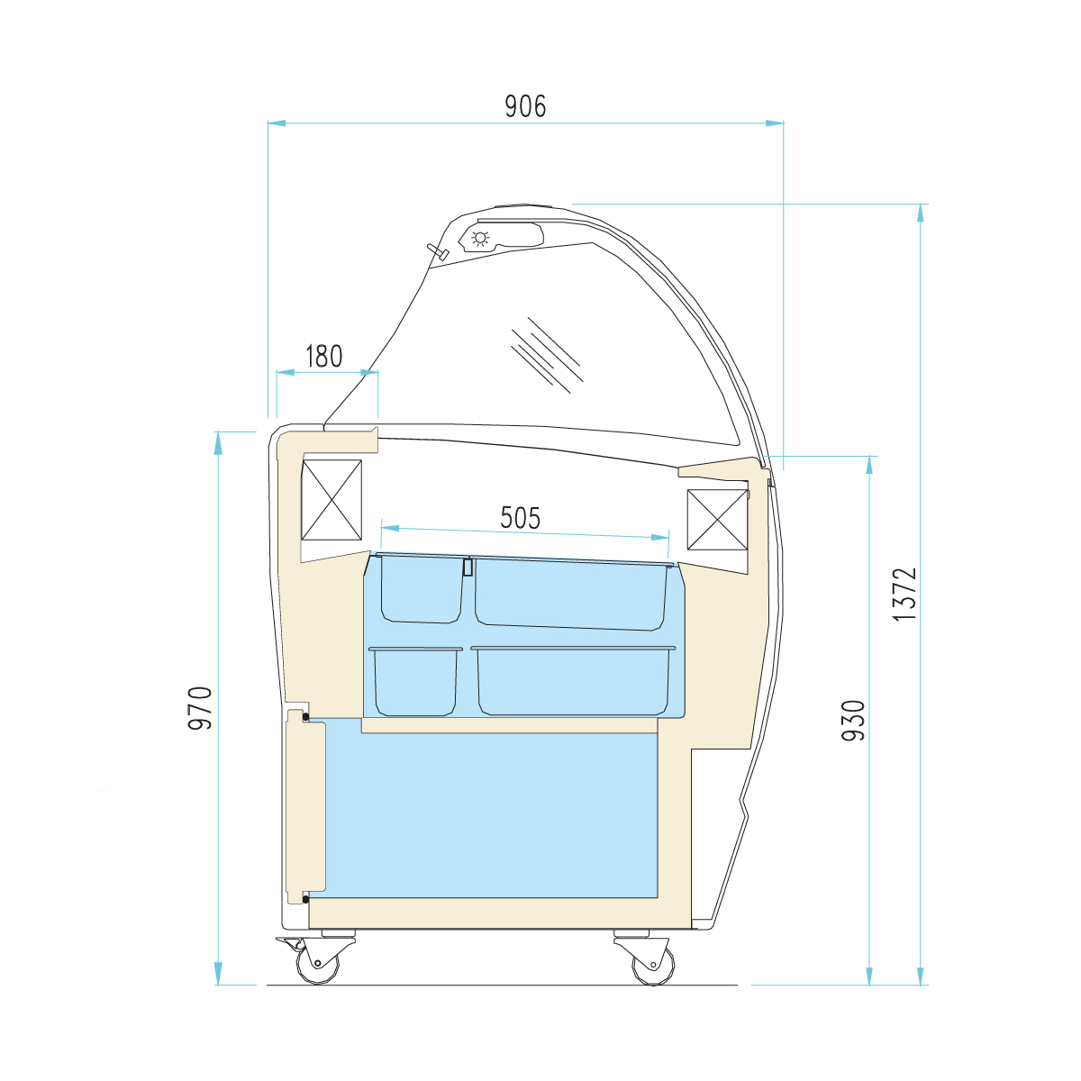 'Eξωτερικές διαστάσεις 1647x906x1372(h)mm Χωρητικότητα 13+13 λεκανάκια 5lt (2 σειρές) Θερμοκρασία -16ºC / -14ºC Ισχύς 980Watt / 230V / 50Hz Ψύξη Στατική Απόψυξη Αυτόματη με hot gas Ψυκτικό υγρό R290 Συμπιεστές 2 (κλειστού τύπου) Φωτισμός LED Κλιματική κλάση 4 (+30oC & 55%RH) Βάρος 192 Kg Διακόσμηση όψης Κουρτίνα νυκτός Ψυχόμενη αποθήκη για 7 (+7) λεκανάκια Δεύτερη σειρά λεκανάκια καθ'' ύψος Ροδάκια με φρένο ΤΑ ΛΕΚΑΝΑΚΙΑ ΠΑΓΩΤΟΥ ΔΕΝ ΣΥΜΠΕΡΙΛΑΜΒΑΝΟΝΤΑΙ'