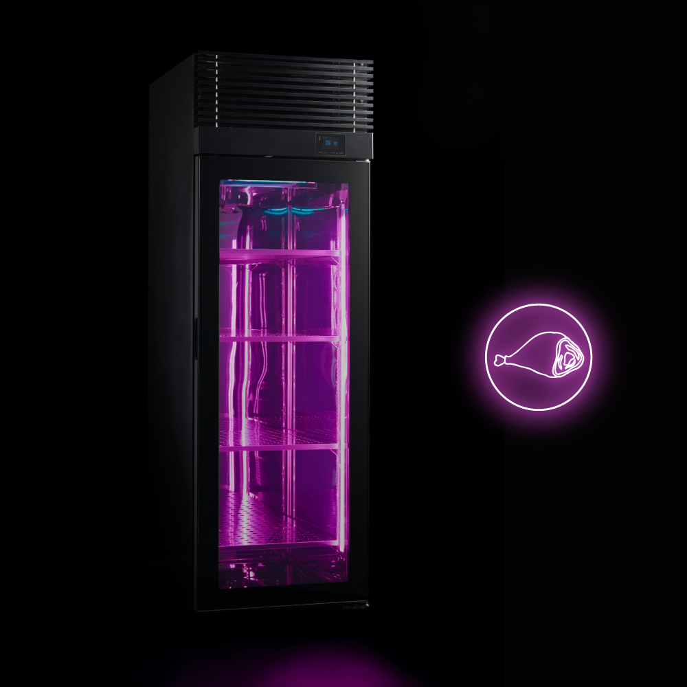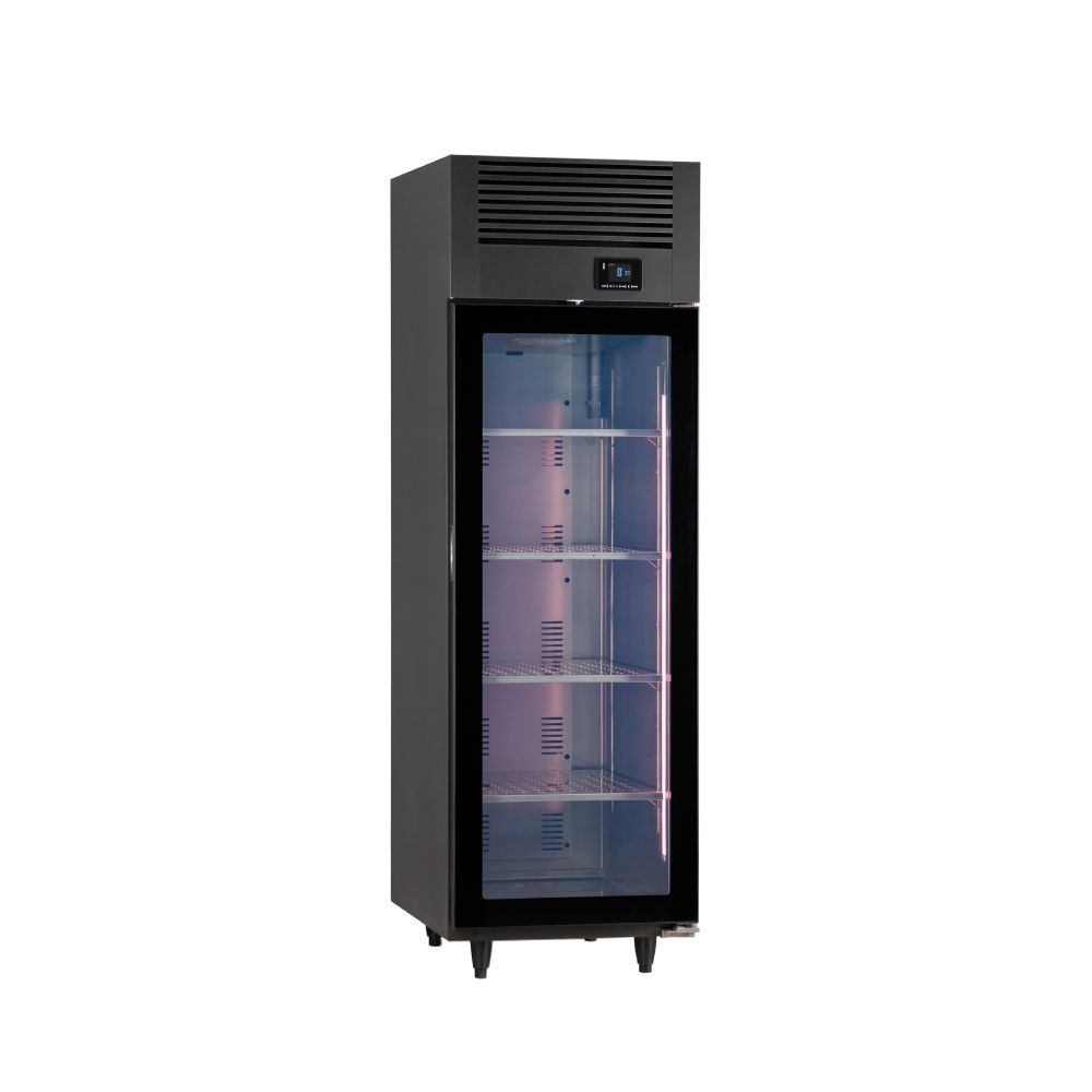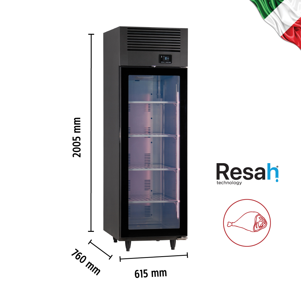 Εξωτερικές διαστάσεις 615x760x2005(h)mm Εσωτερικές διαστάσεις 500x650x1450(h)mm Χωρητικότητα 470 lt Θερμοκρασία -1ºC / +2οC Υγρασία 70-80% Ισχύς 405Watt / 220V / 50Hz Ψύξη Βεβιασμένη Απόψυξη Αυτόματη Ψυκτικό υγρό R290 Ράφια 4 (467x567mm) Φωτισμός LED Βάρος 85 kg Ηλεκτρονικό/ς θερμοστάτης/θερμόμετρο Οθόνη αφής (touch screen) 4 ποδαράκια