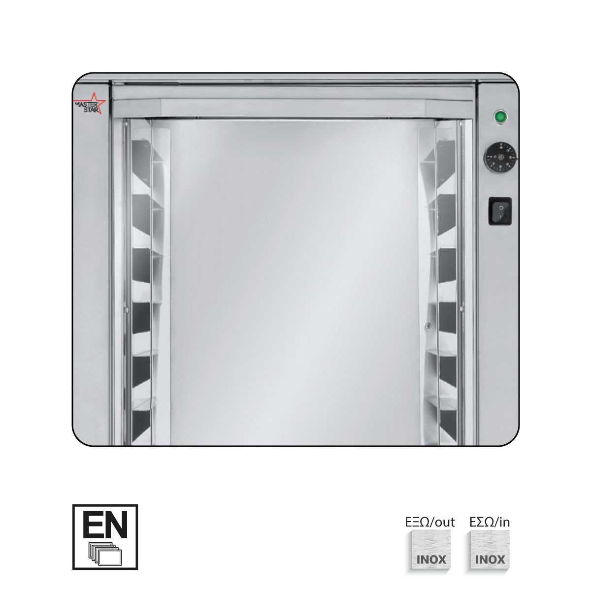Διαστάσεις 595x545x840(h)mm Χωρητικότητα 8 λαμαρίνες (429x345mm) Απόσταση μεταξύ των λαμαρινών 74 mm Θερμοκρασία +30°C - +60oC Θερμοστάστης Αναλογικός Ισχύς 1200 Watt, 230V / 50-60Hz Λειτουργίες Στοφάρισμα Υλικό Εξ ολοκλήρου ανοξείδωτη Βάρος 25.8 Kg ΔΕΝ συμπεριλαμβάνονται λαμαρίνες ή GN.