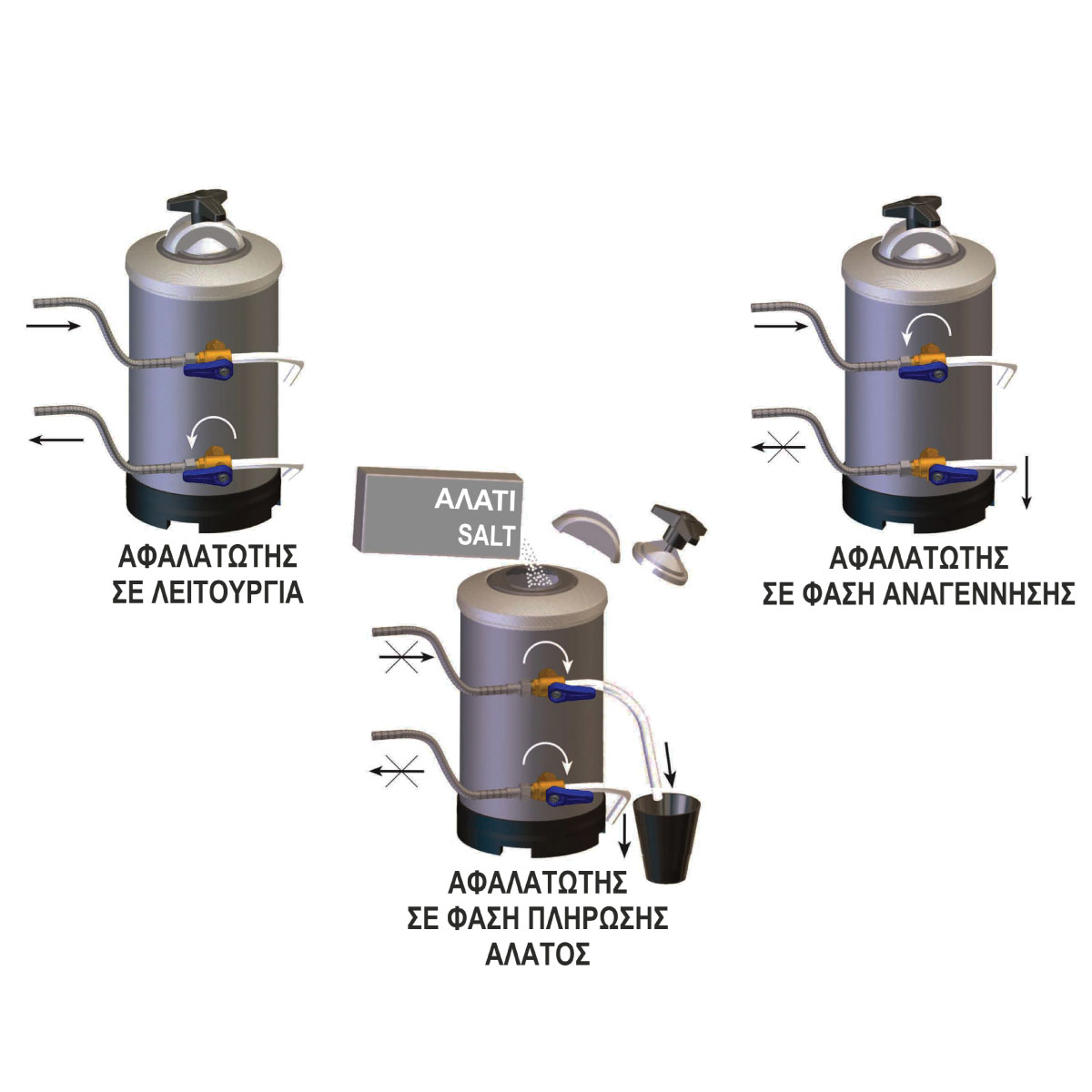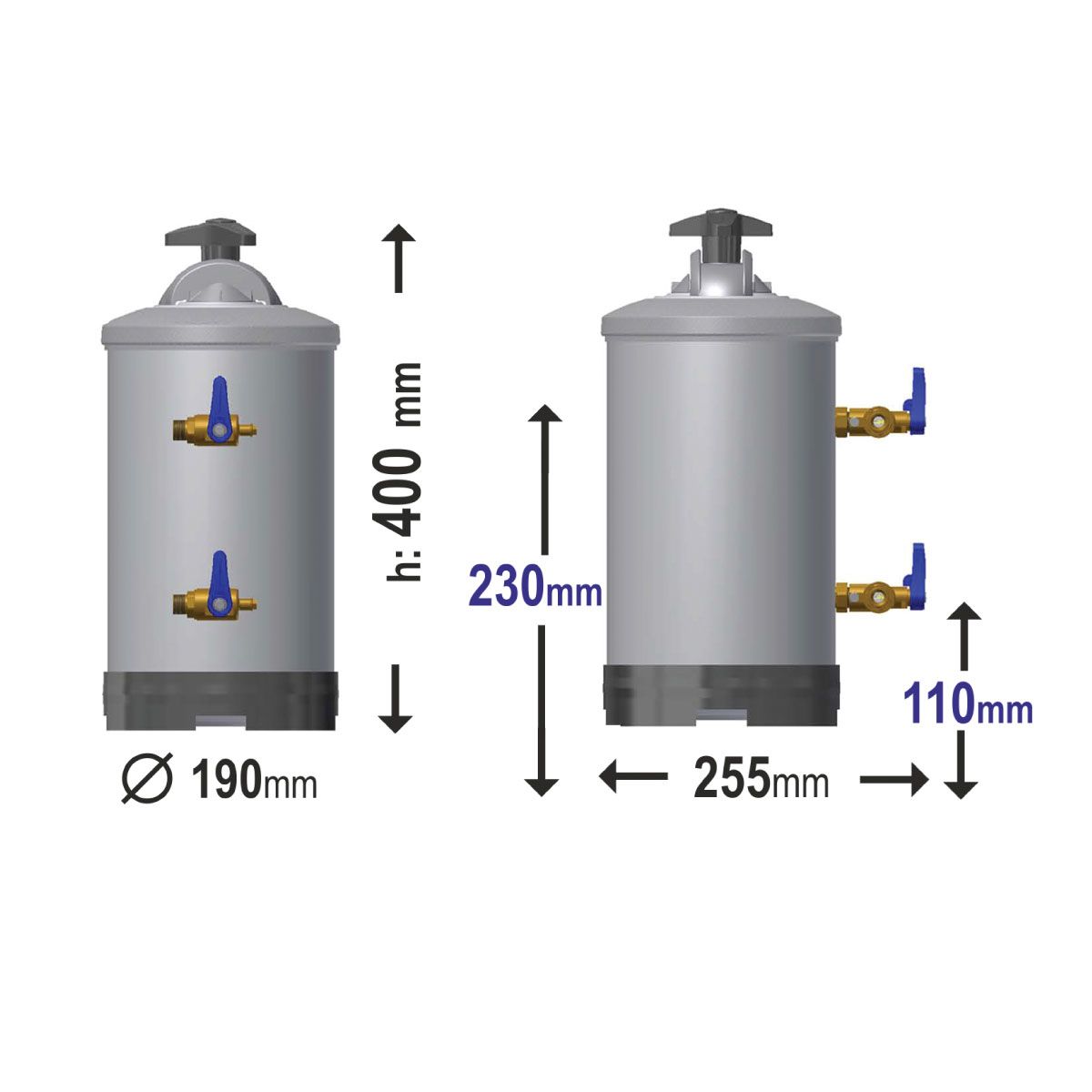 Διαστάσεις Ø 190x400mm Μαγειρικό αλάτι χονδρό ανά αναγέννηση 1 kg Πίεση νερού min 1 bar - max 8 bar Ρητίνη 5,6 lt Απόδοση 1680 lt Μέγιστη σκληρότητα 90°f Μέγιστη ροή νερού / h 1000 lt Αφαλατώνει 1680 lt νερού σε τιμές σκληρότητας: 20of, 11od, 200 ppm CaCo3