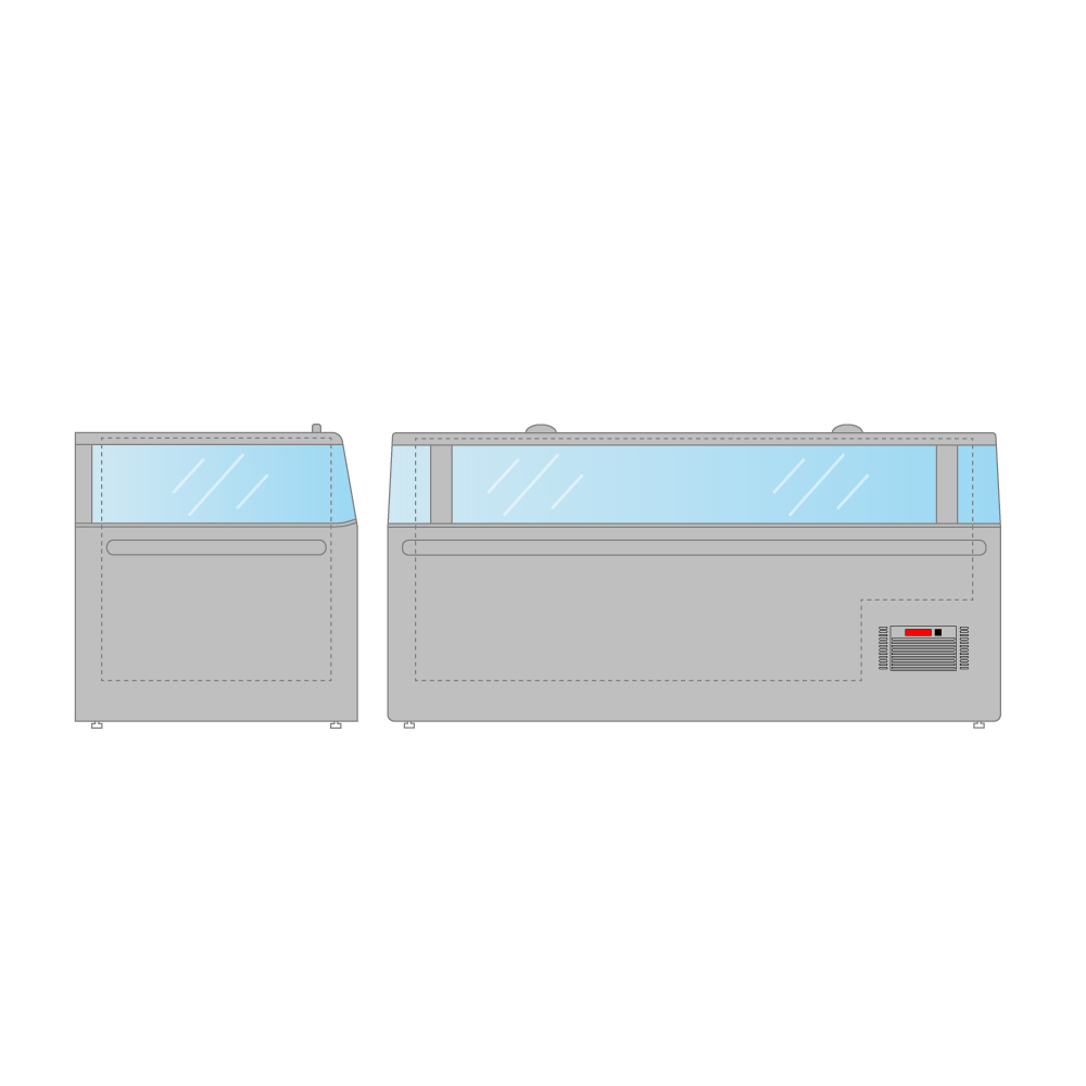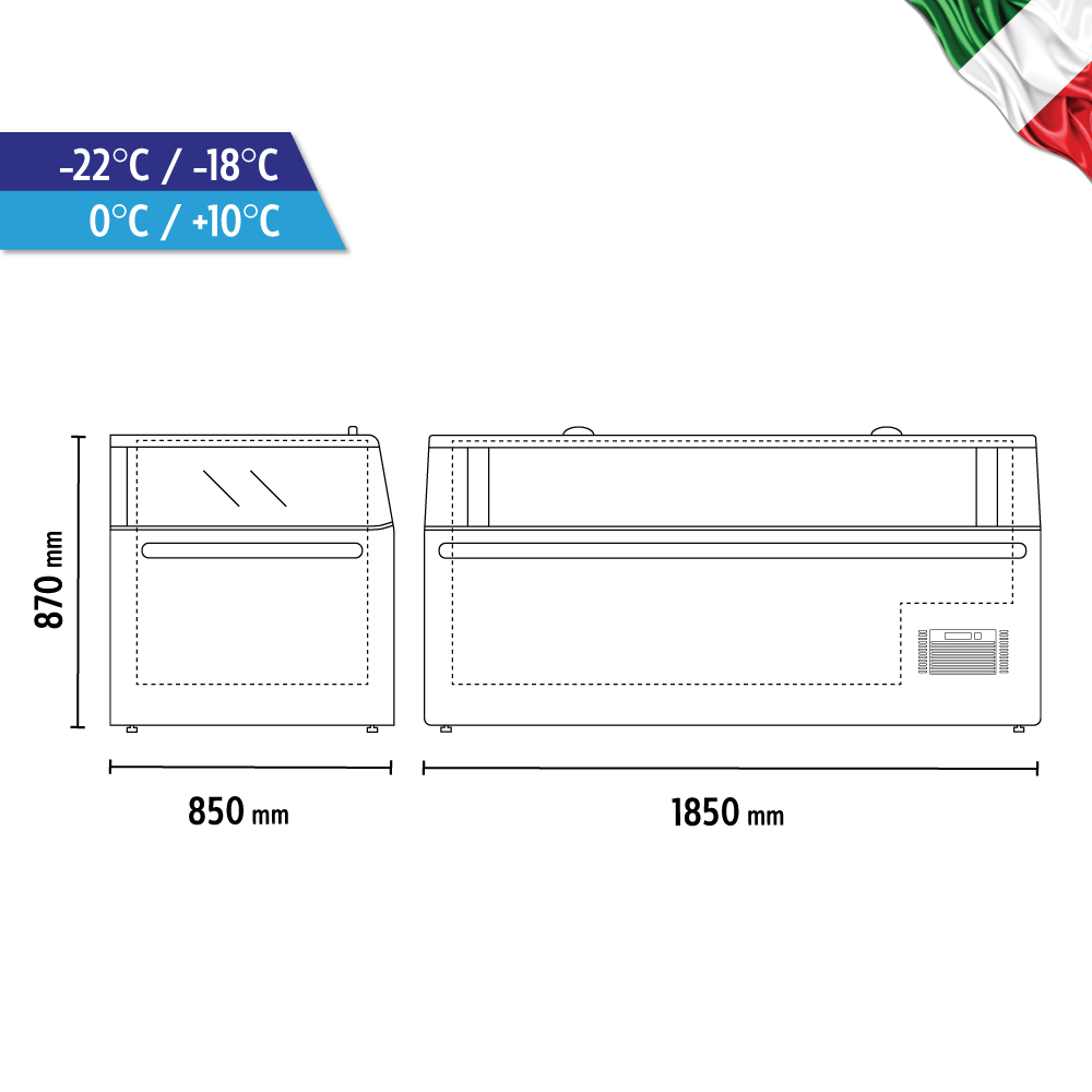 Εξωτερικές διαστάσεις 1850x850x870(h)mm Εσωτερικές διαστάσεις 1682x691x733(h)mm Χωρητικότητα 745 lt Θερμοκρασία κατάψυξης -22°C / -18 oC Θερμοκρασία συντήρησης 0°C / +10ºC Ισχύς 460Watt / 220-240V/ 50Hz Ψύξη Στατική Απόψυξη Αυτόματη (Hot Gas) Freon R290 Κλιματική κλάση 3 (25°C & 60%RH) Φωτισμός LED Βάρος 175 Kg 4 ποδαράκια Ηλεκτρονικός Θερμοστάτης -Ηλεκτρονικό Θερμόμετρο