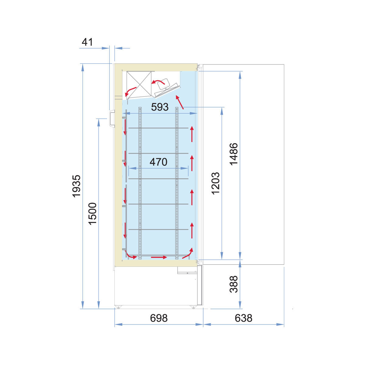 Εξωτερικές διαστάσεις 670x740x1935(h)mm Χωρητικότητα 485 lt Θερμοκρασία -18ºC / -16°C Ισχύς 750Watt / 230V / 50Hz Ψύξη Βεβιασμένη Απόψυξη Αυτόματη Ψυκτικό υγρό R290 Ράφια 7 ψυχόμενα + 1 επίπεδο βάσης Φωτισμός LED Κλιματική κλάση 7 (+35°C & 75%RH) Βάρος 128 Kg Πόρτα με διπλό τζάμι & αυτόματη επαναφορά