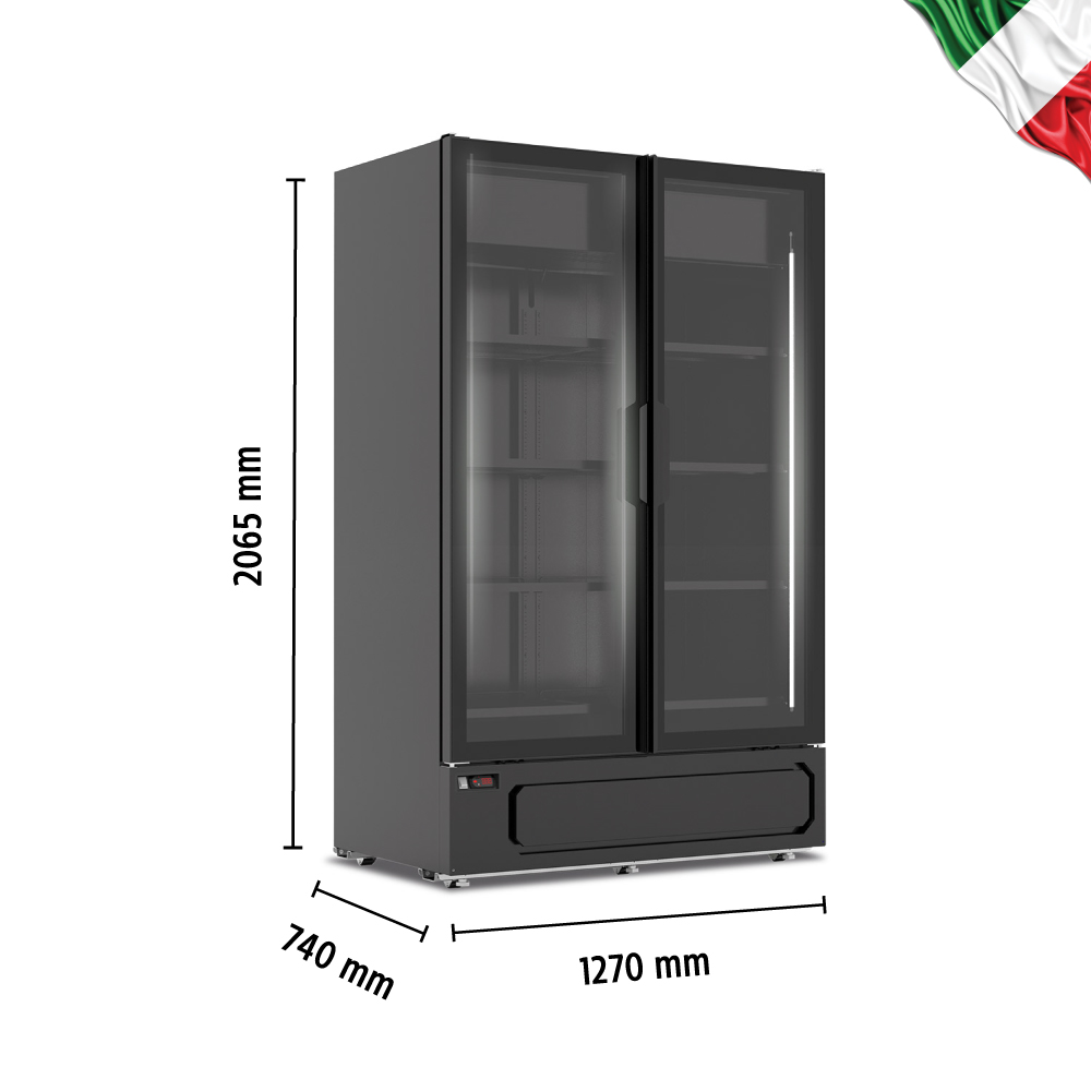 Εξωτερικές διαστάσεις 1270x740x2065(h)mm Εσωτερικές διαστάσεις 1184x638x1594(h)mm Χωρητικότητα 1215 lt Θερμοκρασία +1ºC / +10ºC Ισχύς 300Watt / 220-240V / 50Hz Ψύξη Βεβιασμένη Απόψυξη Αυτόματη Ψυκτικό υγρό R290 Κλιματική κλάση 4 (+30ºC & 55%RH) Ράφια 8 (580x543mm) Φωτισμός LED Βάρος 220 kg Ανοιγόμενες πόρτες με αυτόματη επαναφορά Ηλεκτρονικό/ς θερμοστάτης/θερμόμετρο 4 ροδάκια & 2 ποδαράκια