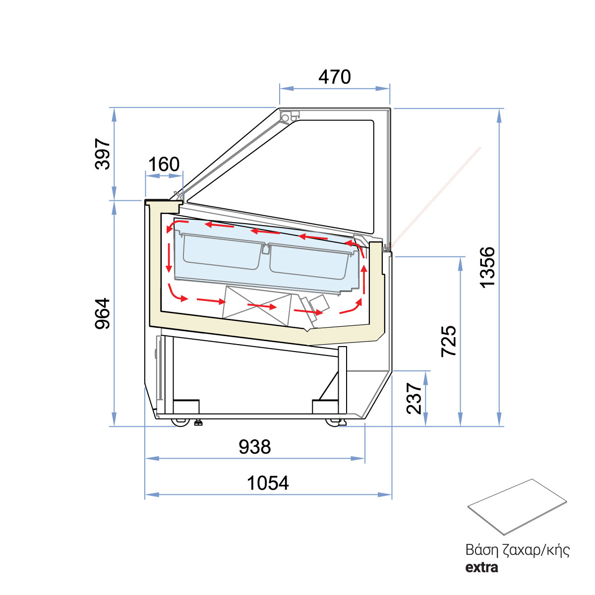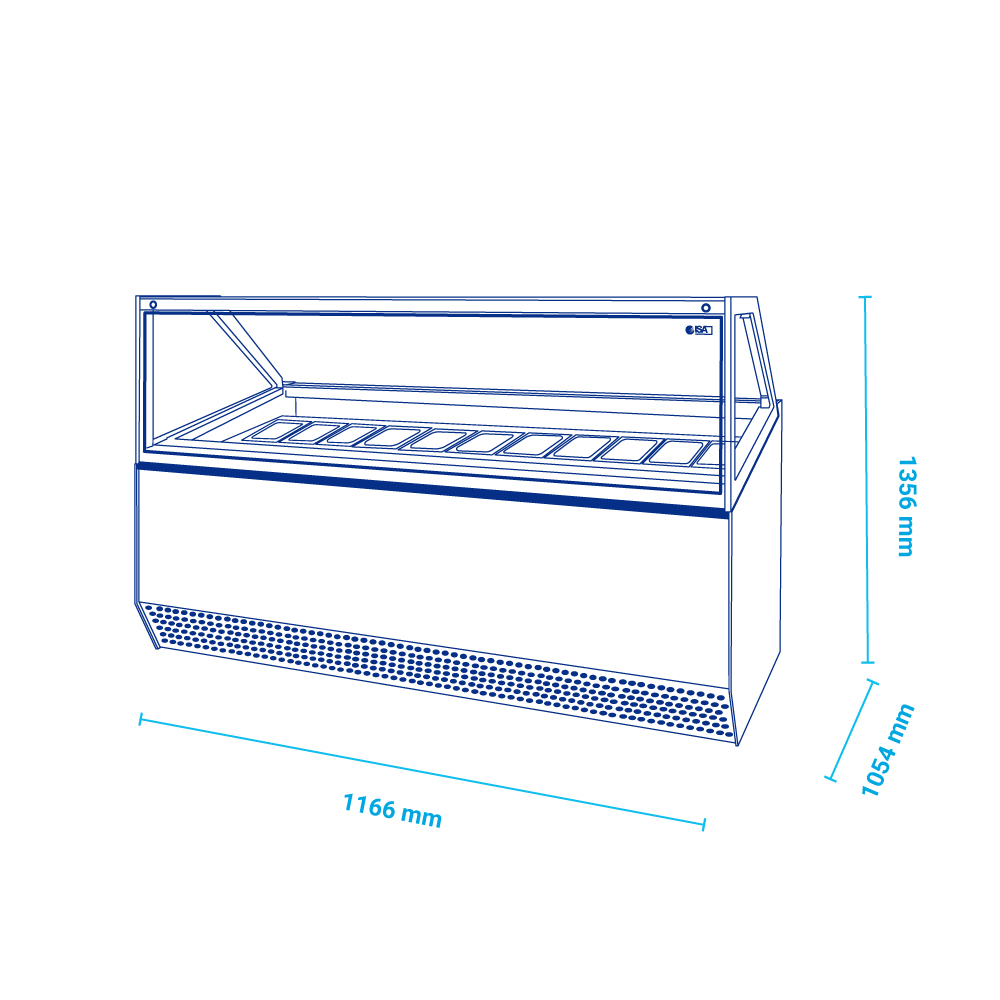 Εξωτερικές διαστάσεις 1166x1054x1356(h)mm Χωρητικότητα 12 (λεκανάκια 5 lt) Βάση Ζαχαροπλαστικής 1046 x 720 mm Θερμοκρασία -20ºC / +2ºC Ισχύς 1050Watt / 230V / 50Hz Ψύξη Βεβιασμένη Απόψυξη Αυτόματη (με αναστροφή κύκλου) Ψυκτικό υγρό R290 Συμπιεστές 1 Φωτισμός LED Κλιματική κλάση 7 (+35oC & 75%RH) Βάρος 200 Kg Χωρίς αποθήκη Ρόδες πολλαπλής κατεύθυνσης Ηλεκτρονικός πίνακας λειτουργιών Κουρτίνα νυκτός