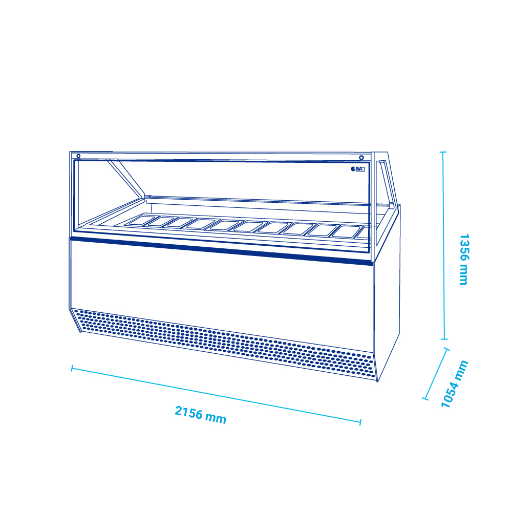 Εξωτερικές διαστάσεις 2156x1054x1356(h)mm Χωρητικότητα 24 (λεκανάκια 5 lt) Βάση Ζαχαροπλαστικής 2036 x 720 mm Θερμοκρασία -20ºC / +2ºC Ισχύς 1990Watt / 230V / 50Hz Ψύξη Βεβιασμένη Απόψυξη Αυτόματη (με αναστροφή κύκλου) Ψυκτικό υγρό R290 Συμπιεστές 2 Φωτισμός LED Κλιματική κλάση 7 (+35oC & 75%RH) Βάρος 360 Kg Χωρίς αποθήκη Ρόδες πολλαπλής κατεύθυνσης Ηλεκτρονικός πίνακας λειτουργιών Κουρτίνα νυκτός