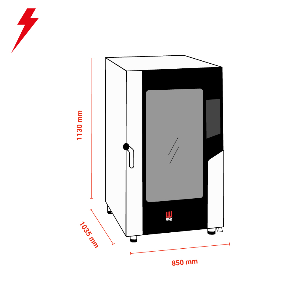 Διαστάσεις 850x1035x1130(h)mm Χωρητικότητα 10 λαμαρίνες 400x600mm Απόσταση μεταξύ θέσεων 80 mm Θερμοστάτης 30°C - 270oC Προγράμματα 100 Ισχύς 15.4 KWatt/ 380V/ 3N / 50-60Hz Βάρος 131 Kg Αυτόμητο πλύσιμο 3 ανεμιστήρες εναλλασσόμενης φοράς Ρυθμιζόμενα πόδια