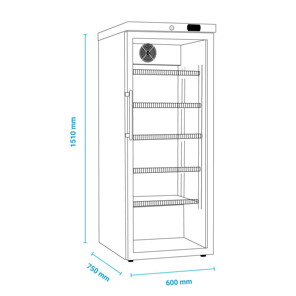 Εξωτερικές διαστάσεις 600x750x1510(h)mm Χωρητικότητα 324 lt Ισχύς 200Watt / 230V / 50 Hz Θερμοκρασία +2ºC / +15ºC Ψύξη Βεβιασμένη Απόψυξη Αυτόματη Ψυκτικό υγρό R600a Ράφια 5 (475x470mm) Φωτισμός LED Βάρος 79 Kg Θερμοστάτης ασφαλείας Αυτόματη επαναφορά πόρτας / Δυνατότητα αναστροφής φοράς πόρτας Κλειδαριά 4 ποδαράκια + 2 ροδάκια