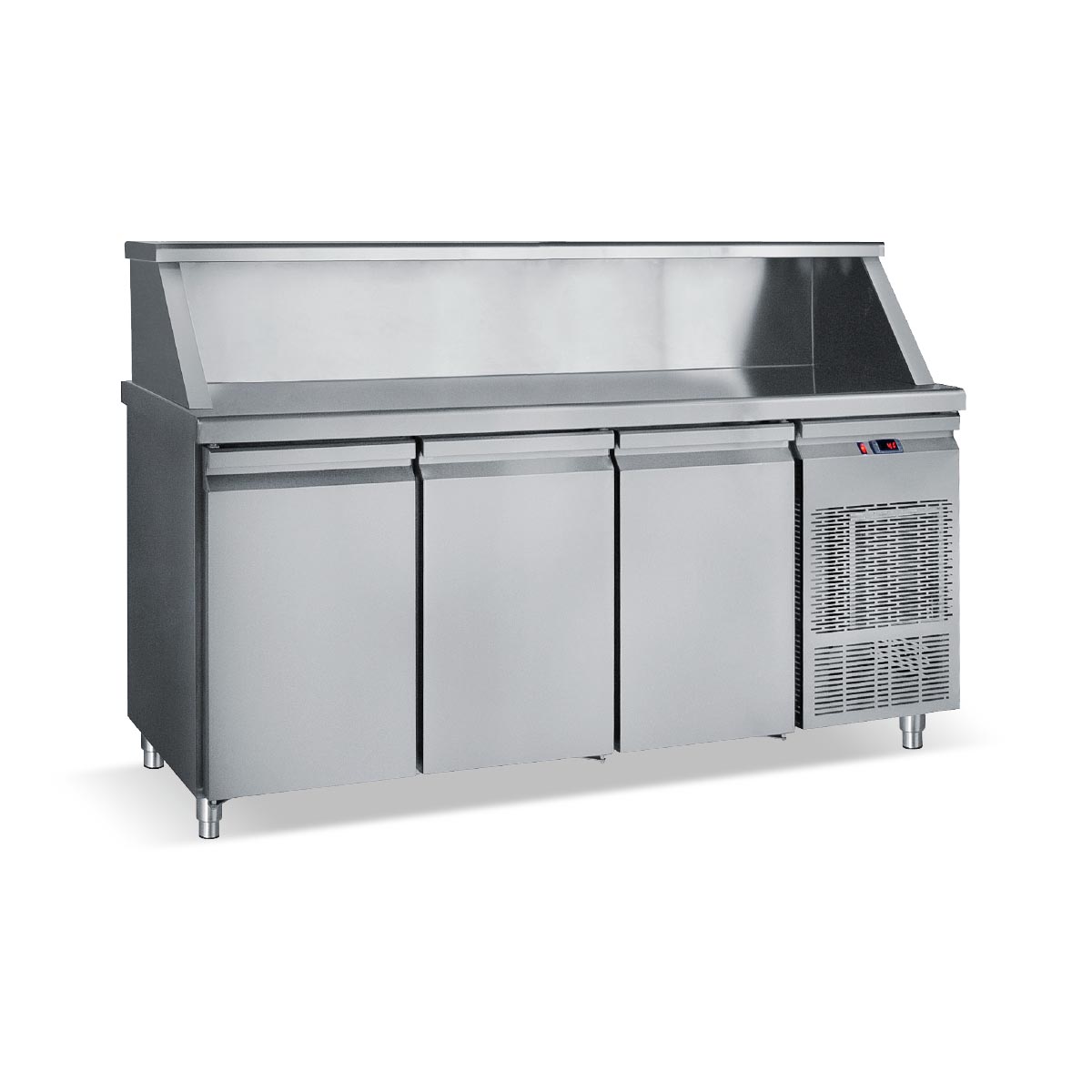 Κατασκευασμένο από ανοξείδωτο χάλυβα Μόνωση με οικολογική πολυουρεθάνη πάχους 5 cm Στοιχείο βαμμένο με αντιδιαβρωτική προστασία Πάτος με υγειονομικές γωνίες Πόρτες με αυτόματη επαναφορά κάτω από 90° Πόδια ανοξείδωτα ρυθμιζόμενα Σχάρες πλαστικοποιημένες ρυθμιζόμενες καθ’ ύψος Πάσο στην επιφάνεια εργασίας Φρέον οικολογικό