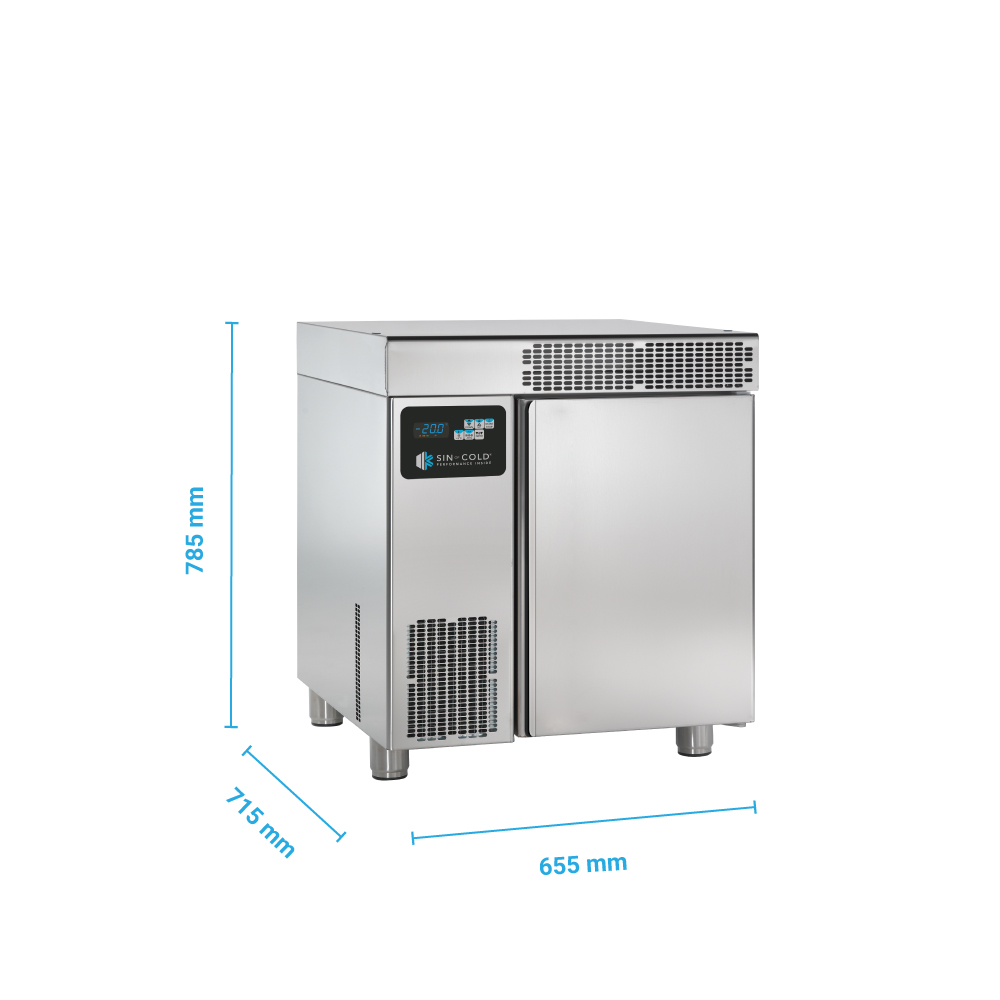 Διαστάσεις 655x715x785(h)mm Χωρητικότητα 5 GN 1/1 ή 5 GN 2/3 ή 6 λεκανάκια παγωτού (5lt) Ικανότητα Ψύξης 12 kg σε 90' (+90oC σε +3oC) Ικανότητα Κατάψυξης 7 kg σε 240' (+90oC έως -18oC) Απόψυξη Αυτόματη Ισχύς 900W / 5.5A / 230V / 50Hz Ψυκτικό υγρό R452a Απόσταση λαμαρίνων 50 mm Τα λεκανάκια παγωτού, τα GN και οι λαμαρίνες δε συμπεριλαμβάνονται.