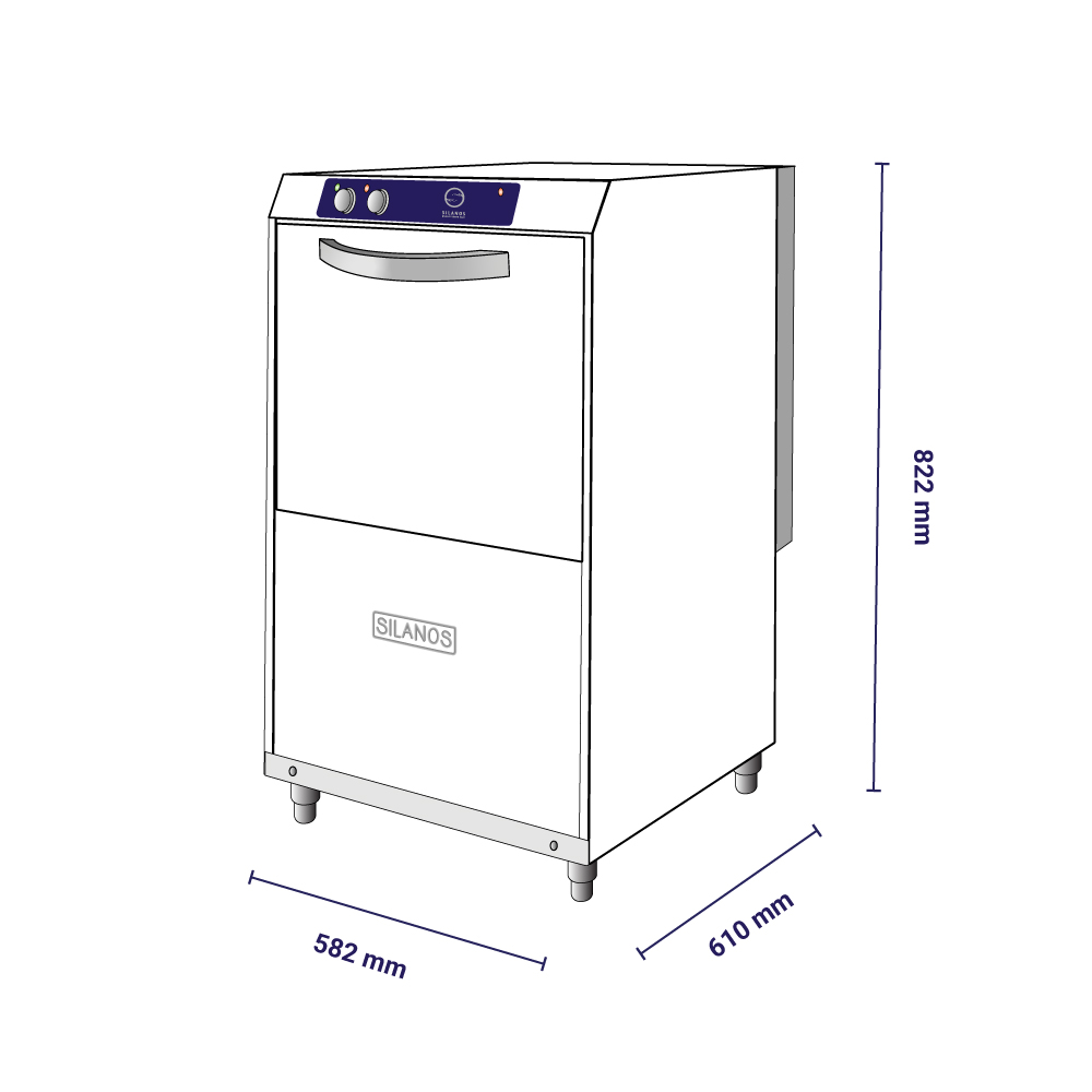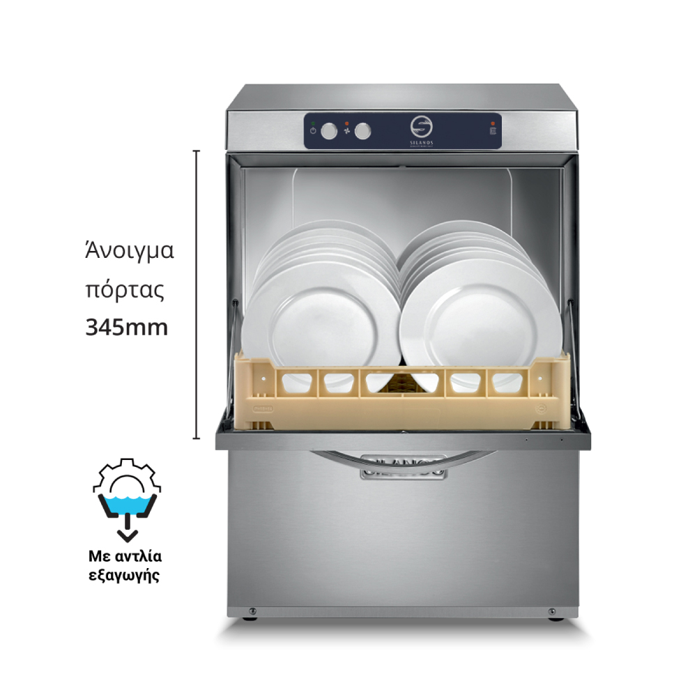 Διαστάσεις 570x610x825(h)mm Άνοιγμα πόρτας 345 mm Καλάθι 500x500 mm Κύκλος πλύσης 2-3 min Ισχύς 4900W / 230V / 50Hz Αντίσταση κάδου 2500 Watt Αντίσταση Boiler 4500 Watt Αντλία πλύσης 0,4 KWatt Πλύση Πάνω-κάτω Απόπλυση Πάνω-κάτω Με ηλεκτρικό δοσομετρητή στεγνωτικού και απορρυπαντικού Ανοξείδωτοι βραχίονες πάνω-κάτω Διπλά τοιχώματα Συμπεριλαμβάνονται: 2 καλάθια πιάτων, 1 καλάθι ποτηριών & 1 θήκη για μαχαιροπήρουνα.