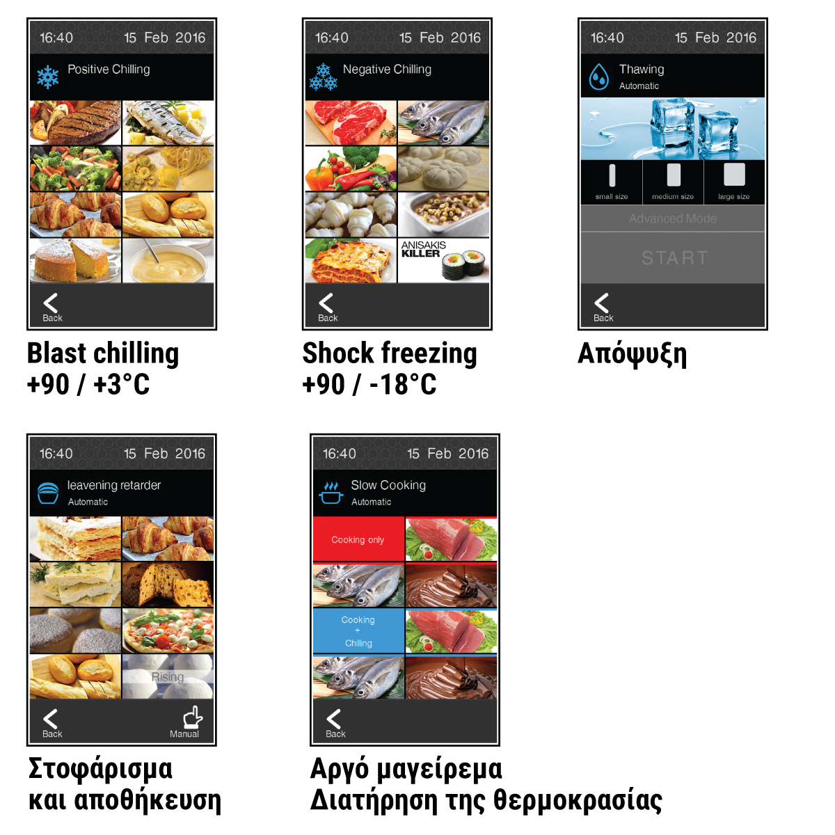 Διαστάσεις 790x870x1460(h)mm Ισχύς 2160 Watt, 230V / 50Hz Θερμοκρασία -40 / +85°C Απόψυξη Αυτόματη Ικανότητα ψύξης 50 kg σε 90' (+90oC σε +3oC) Ικανότητα κατάψυξης 35 kg σε 240' (+90oC έως -18oC) Απόσταση επιπέδων 75 mm Χωρητικότητα 8 GN 1/1 ή 8 ταψιά 400x600mm Καθαρό Βάρος 150 Kg USB σύνδεση WI-FI σύνδεση Δυνατότητα αναστροφής φοράς πόρτας (κατ΄'οπιν παραγγελίας με έξτρα χρέωση) Τα λεκανάκια παγωτού, τα GN και οι λαμαρίνες δε συμπεριλαμβάνονται