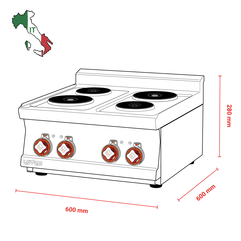 Διαστάσεις 600x600x280(h)mm Ισχύς 6 KWatt / 400V / 50-60Hz Εστίες 2 x (1Kw) & 2 x (2Kw) Βάρος 27 kg Κωδικός Προϊόντος 16030630 Ρυθμιζόμενα ποδαράκια Φωτεινή προειδοποίηση για υπολοιπόμενη θερμοκρασία στις εστίες