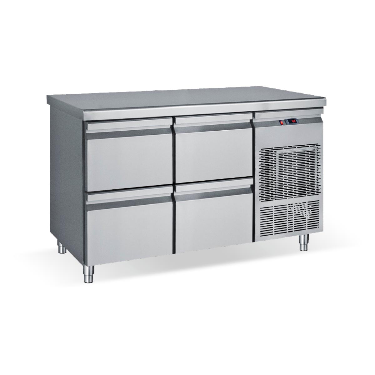 Κατασκευασμένο από ανοξείδωτο χάλυβα Μόνωση με οικολογική πολυουρεθάνη πάχους 5 cm Στοιχείο βαμμένο με αντιδιαβρωτική προστασία Συρτάρια GN Πάτος με υγειονομικές γωνίες Πόδια ανοξείδωτα ρυθμιζόμενα Φρέον οικολογικό
