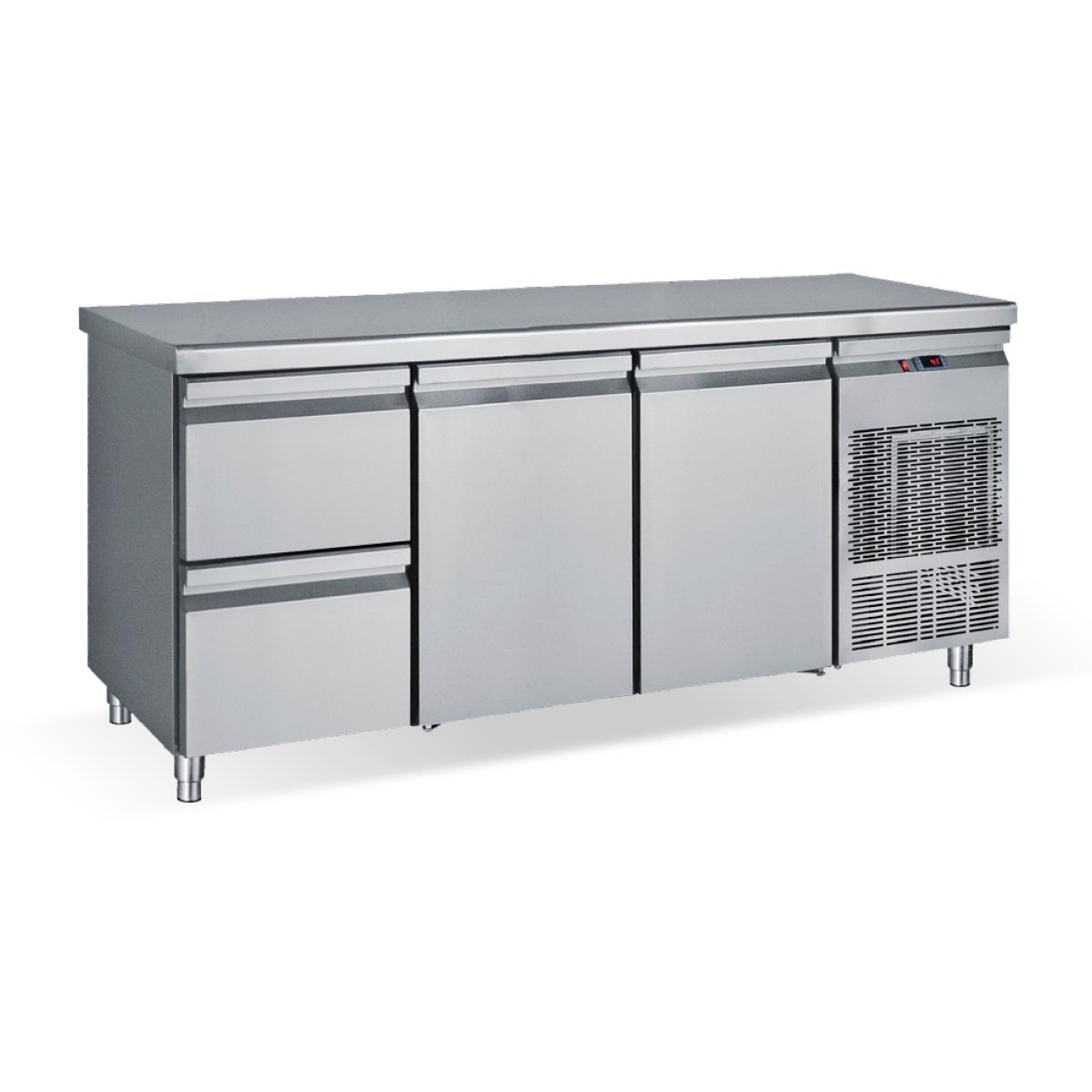 Κατασκευασμένο από ανοξείδωτο χάλυβα Μόνωση με οικολογική πολυουρεθάνη πάχους 5 cm Στοιχείο βαμμένο με αντιδιαβρωτική προστασία Πάτος με υγειονομικές γωνίες Πόρτες με αυτόματη επαναφορά κάτω από 90 Συρτάρια GN Πόδια ανοξείδωτα ρυθμιζόμενα Σχάρες πλαστικοποιημένες ρυθμιζόμενες καθ’ ύψος Οδηγούς inox για GN Φρέον οικολογικό