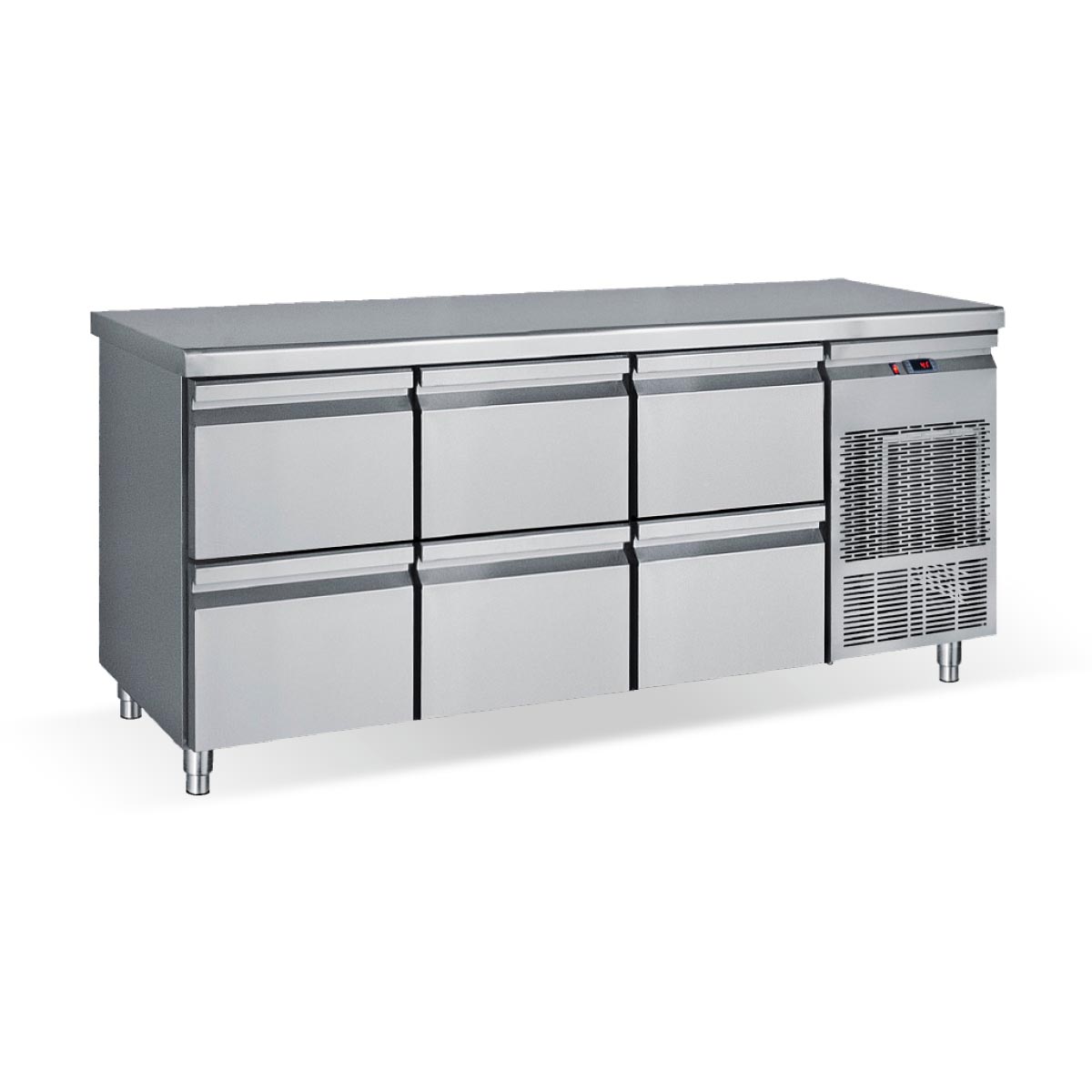 Κατασκευασμένο από ανοξείδωτο χάλυβα Μόνωση με οικολογική πολυουρεθάνη πάχους 5 cm Στοιχείο βαμμένο με αντιδιαβρωτική προστασία Συρτάρια GN Πάτος με υγειονομικές γωνίες Πόδια ανοξείδωτα ρυθμιζόμενα Φρέον οικολογικό