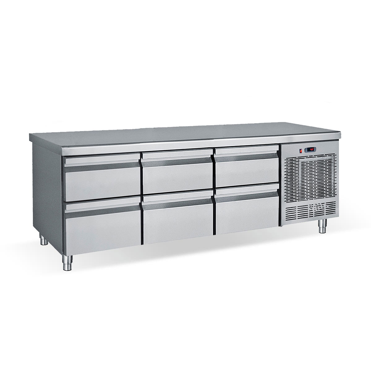 Κατασκευασμένο από ανοξείδωτο χάλυβα Μόνωση με οικολογική πολυουρεθάνη πάχους 5 cm Στοιχείο βαμμένο με αντιδιαβρωτική προστασία Πάτος με υγειονομικές γωνίες Πόδια ανοξείδωτα ρυθμιζόμενα Συρτάρια GN Φρέον οικολογικό