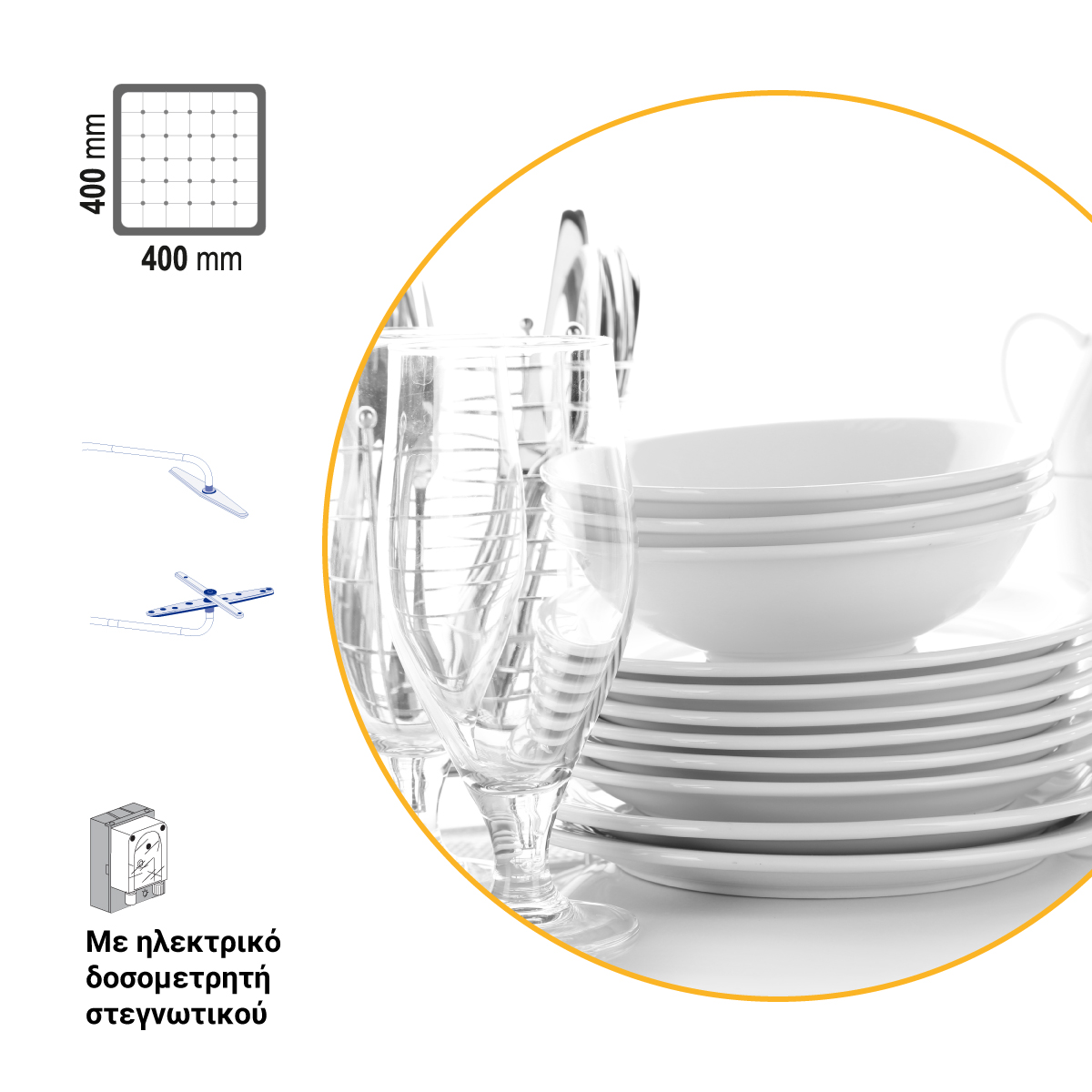 Διαστάσεις 465x510x645(h)mm Άνοιγμα πόρτας 270mm Καλάθι 400x400mm Κύκλος πλύσης 2 min Ισχύς 3000 W / 230V / 50Hz Χωρητικότητα κάδου 12 lt Αντίσταση κάδου 1600 Watt Αντίσταση Boiler 2800 Watt Αντλία πλύσης 0,17 KWatt Πλύση Μόνο κάτω Απόπλυση Πάνω-κάτω Με ηλεκτρικό δοσομετρητή στεγνωτικού Με αντλία εξαγωγής Συμπεριλαμβάνονται: 1 καλάθι ποτηριών & 1 θήκη για μαχαιροπήρουνα