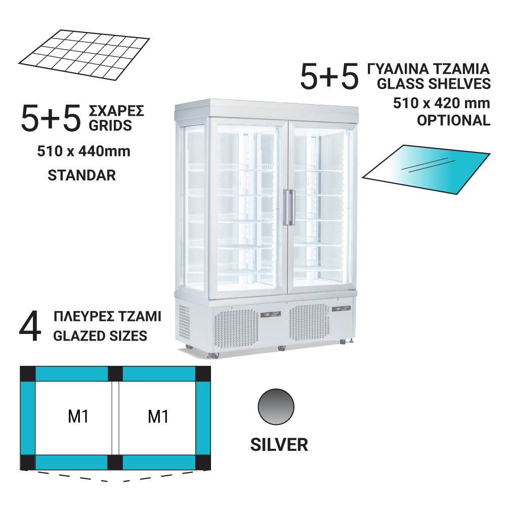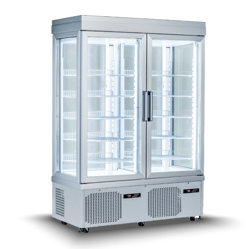 Εξωτερικές διαστάσεις 1320x640x1930(h)mm Εσωτερικές διαστάσεις 1220x540x1350(h)mm Χωρητικότητα 880 lt Ισχύς 1360 Watt, 230V / 50 Hz Θερμοκρασία +5 / -25 οC Ψύξη Βεβιασμένη Ψυκτικό υγρό R290 / R452A Ράφια 10 (510x440mm) Φωτισμός LED (κάθετος) Κλιματική κλάση 4 (+30°C & 55%RH) Βάρος 309 Kg 2 συμπιεστές (2 ανεξάρτητοι χώροι) Ψηφιακό Θερμόμετρο / Ηλεκτρονικός Θερμοστάτης Αυτόματη επαναφορά πόρτας 6 ροδάκια