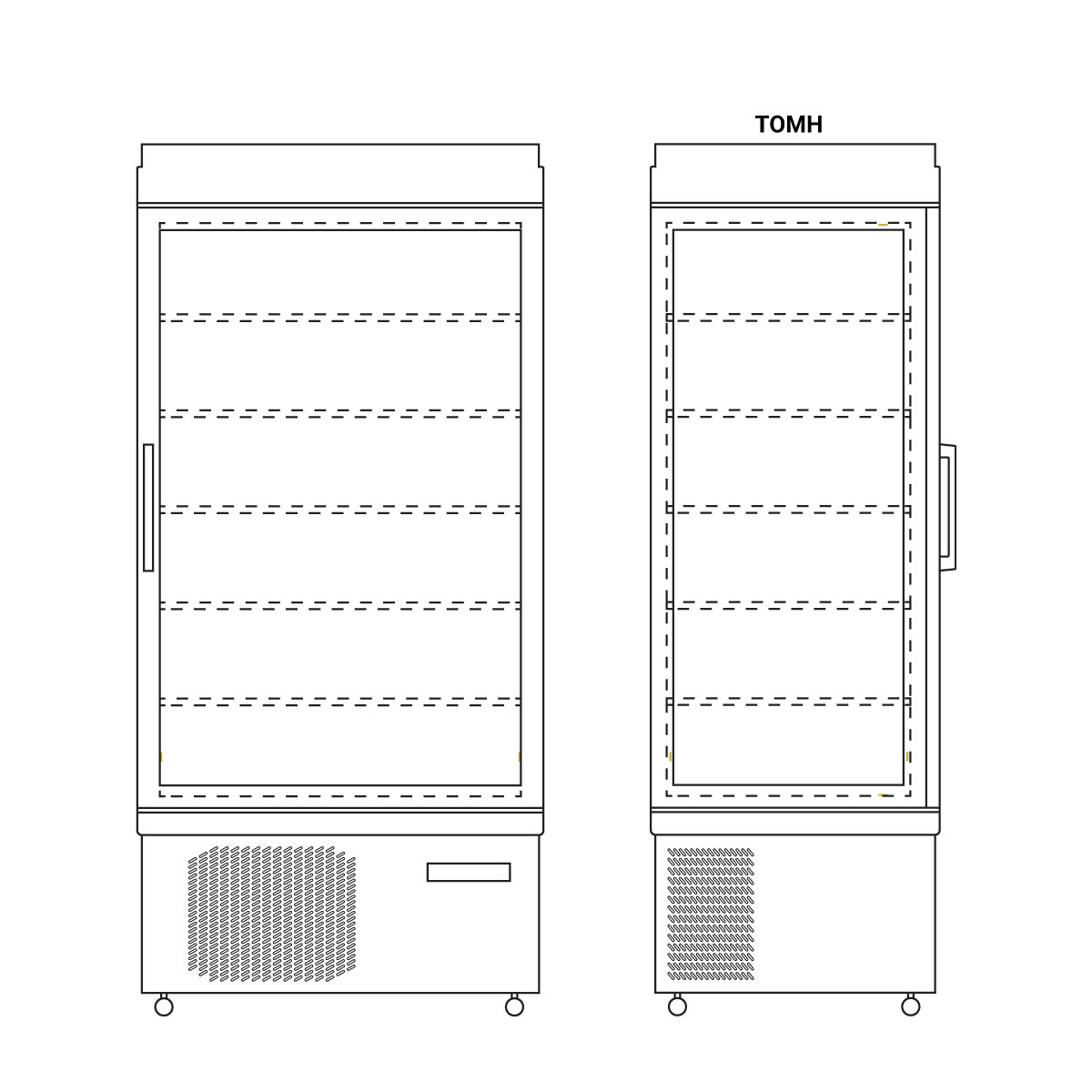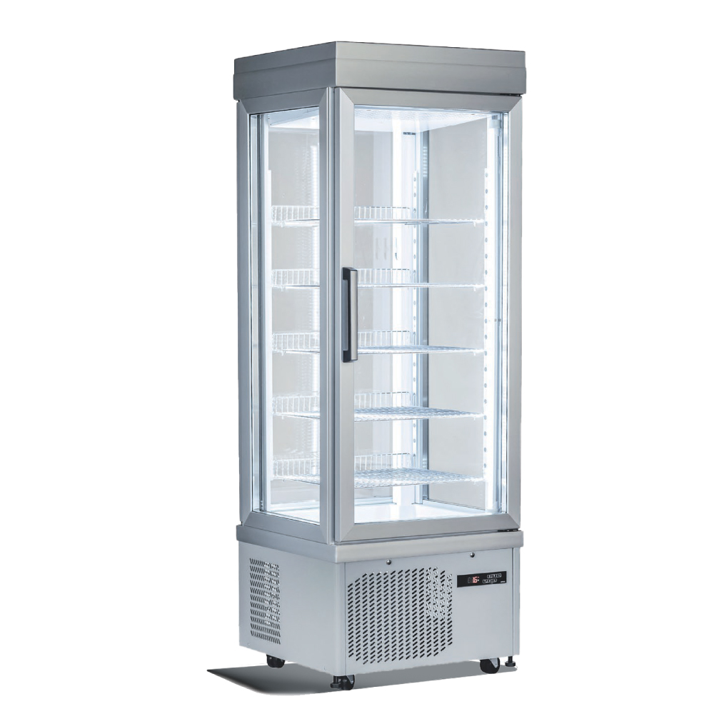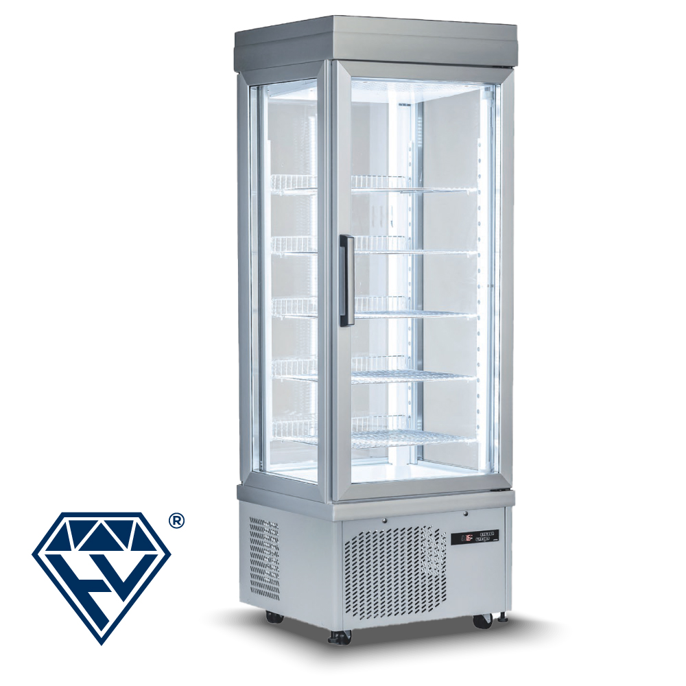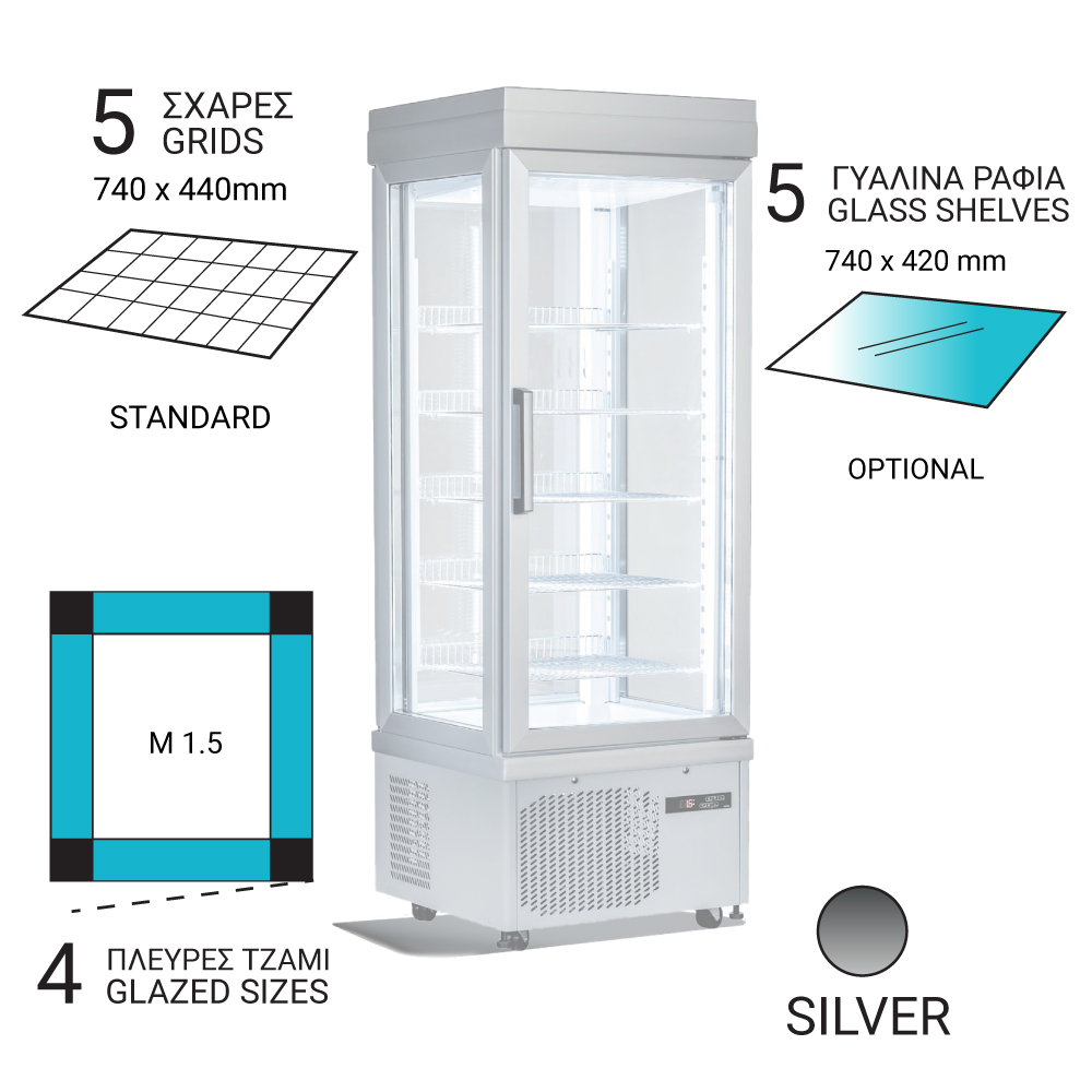 Εξωτερικές διαστάσεις 900x640x1930(h)mm Εσωτερικές διαστάσεις 800x540x1270(h)mm Χωρητικότητα 595 lt Ισχύς 800 Watt, 230V / 50 Hz Θερμοκρασία +5 / -25 οC Ψύξη Βεβιασμένη Ψυκτικό υγρό R507 Ράφια 5 (740x440mm) Φωτισμός LED (κάθετος) Κλιματική κλάση 4 (+30°C & 55%RH) Βάρος 184 Kg Ψηφιακό Θερμόμετρο / Ηλεκτρονικός Θερμοστάτης Αυτόματη επαναφορά πόρτας 4 ροδάκια