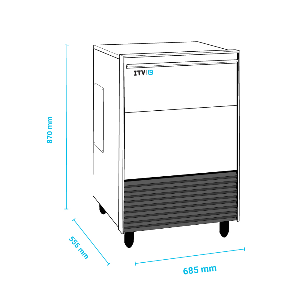 Διαστάσεις 685x555x870*(h)mm Παραγωγή σε 24h αερόψυκτη 66* kg Ισχύς 450 Watt, 230V / 50Hz Παγάκια ανα κύκλο 48 Ψυκτικό υγρό R452a Χωρητικότητα αποθήκης 30 kg Παγάκι συμπαγές 34 gr (38Ø x 38h mm) Καθαρό Βάρος 75 Kg *Με έξτρα πόδια : 950mm *Θερμοκρασία περιβάλλοντος / νερού : 10°C