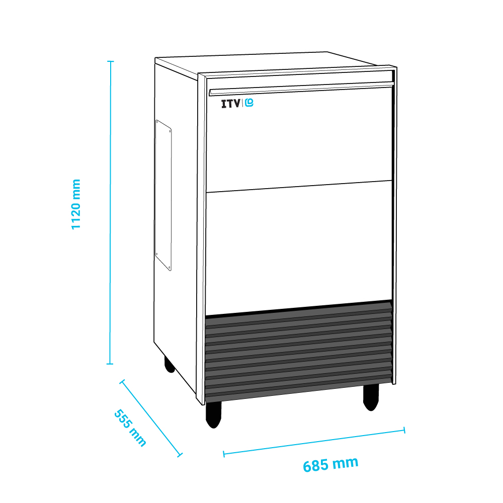 Διαστάσεις 685x555x1120(h)mm Παραγωγή σε 24h αερόψυκτη 90* kg Ισχύς 1780 Watt, 230V / 50Hz Παγάκια ανα κύκλο 24 Ψυκτικό υγρό R452a Χωρητικότητα αποθήκης 60 kg Παγάκι συμπαγές 34 gr (38Ø x 38h mm) Καθαρό Βάρος 90 Kg *Θερμοκρασία περιβάλλοντος / νερού : 10°C