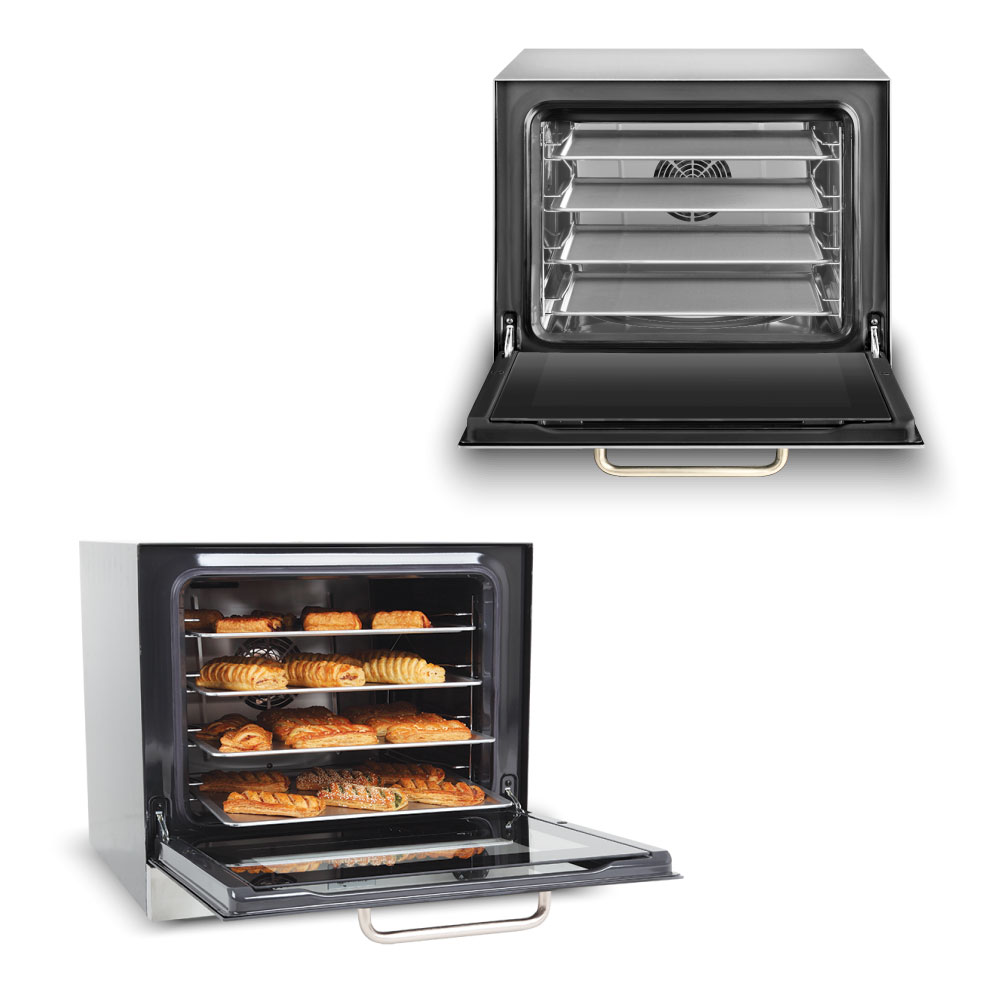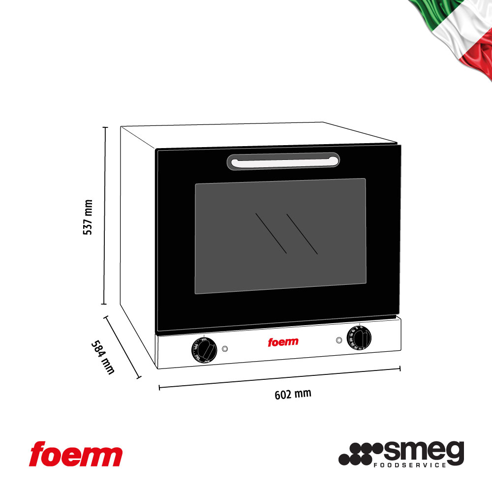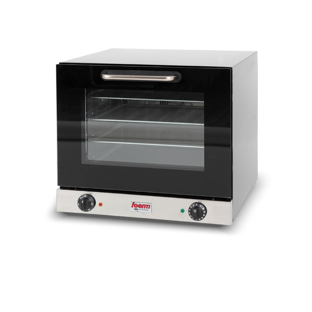 'Διαστάσεις 602x584x537(h)mm Χωρητικότητα 4 λαμαρίνες (435x320) Απόσταση μεταξύ θέσεων 80 mm Θερμοστάτης 50°C - 250oC Χρονοδιακόπτης 1-60'' ρυθμιζόμενος + συνεχής Ισχύς 2.9 KWatt, 230V /50 Hz Λειτουργίες Αερόθερμο Βάρος 32 Kg INOX εξωτερικά Aποσπώμενο & εύκολα καθαριζόμενο τζάμι πόρτας Περιλαμβάνονται 4 λαμαρίνες αλουμινίου 435x320mm'