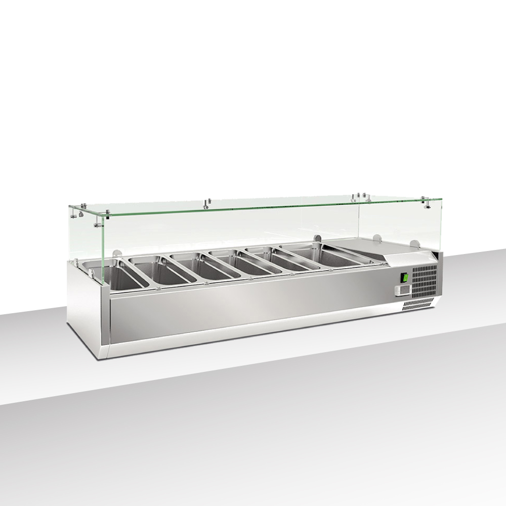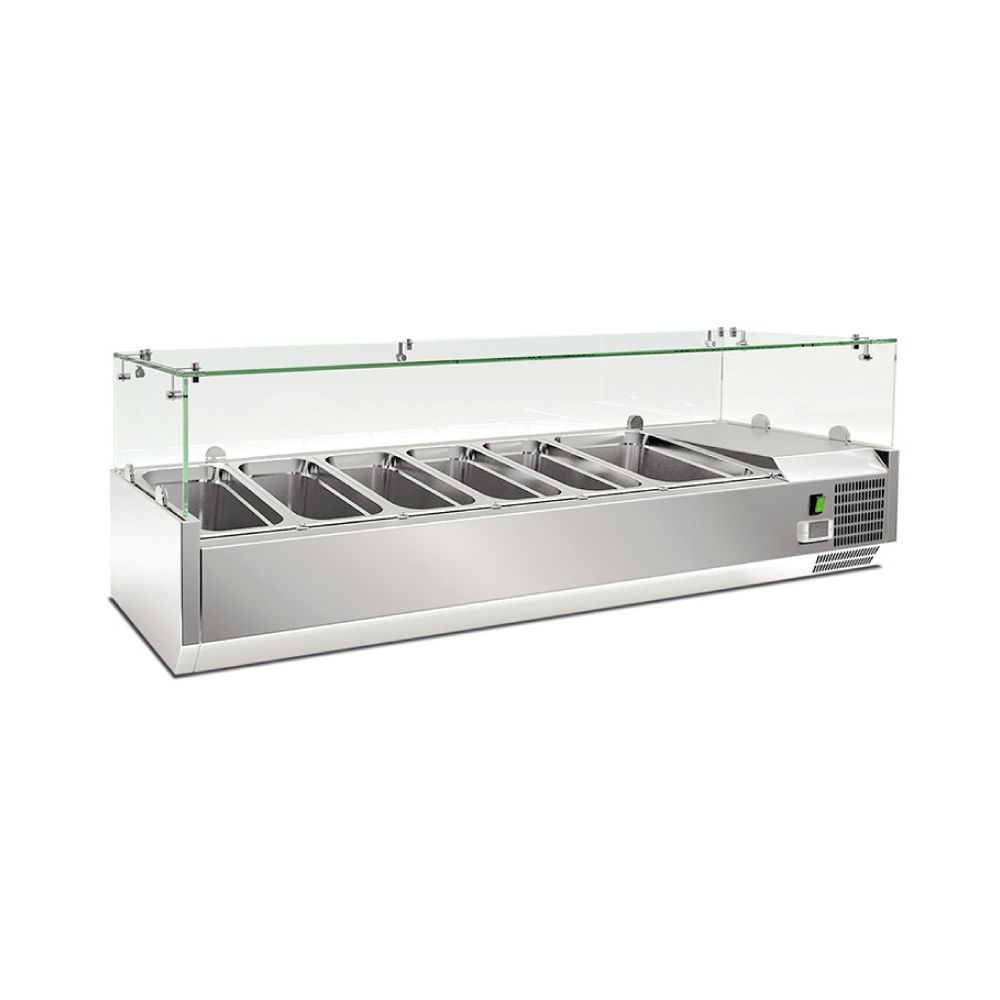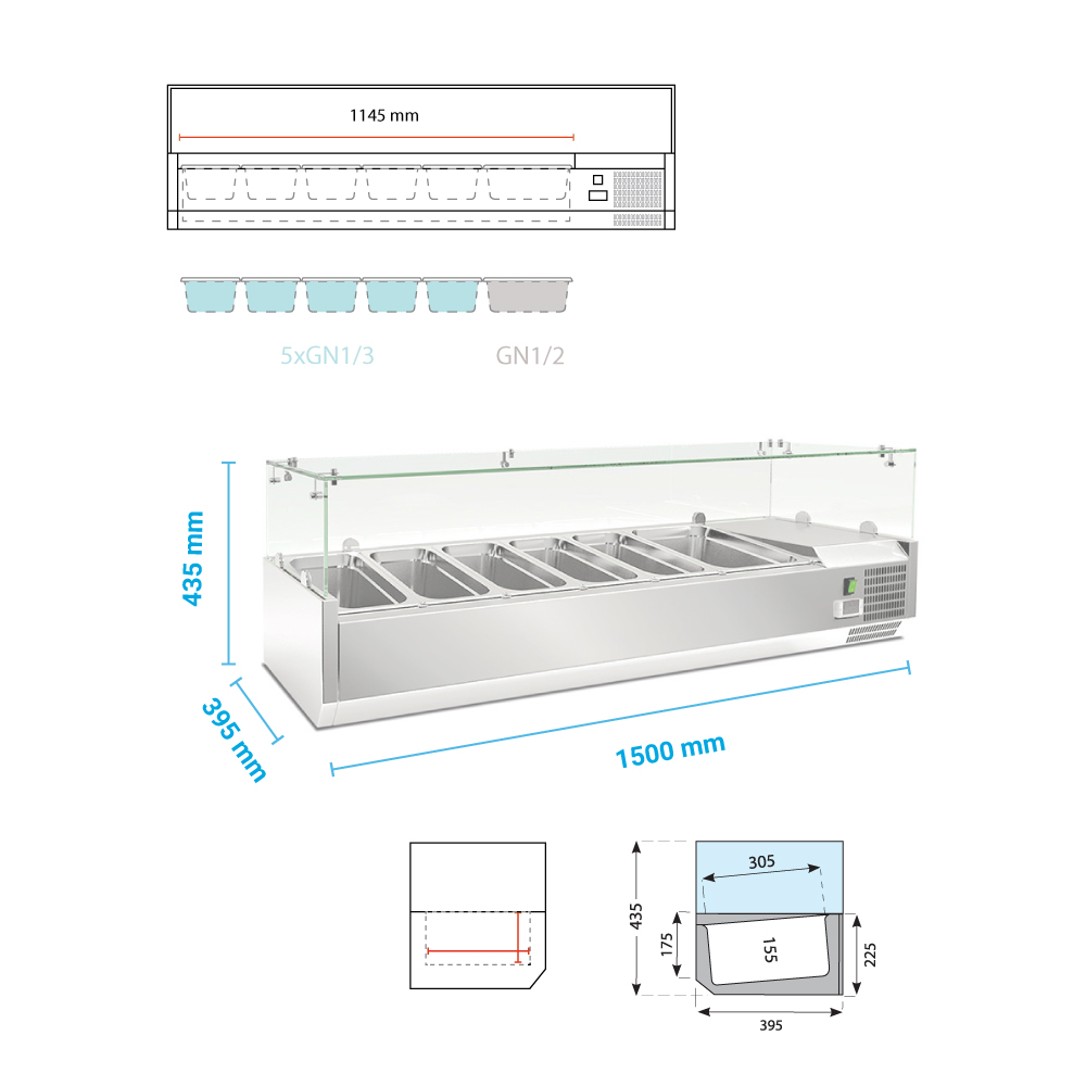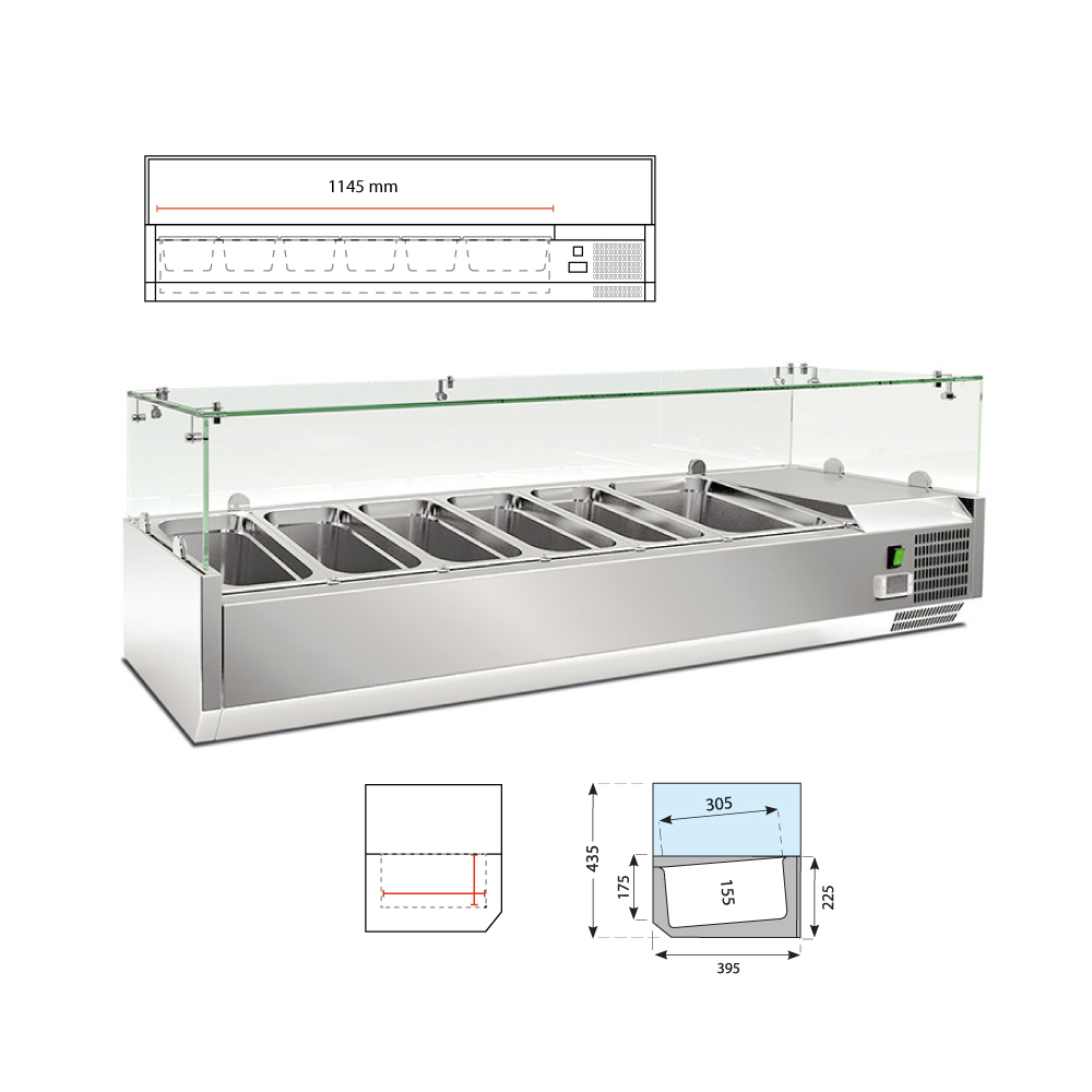 Εξωτερικές διαστάσεις (με τα τζάμια) 1500x395x225(427)(h)mm Εσωτερικές διαστάσεις 1145x305x155(h)mm Αριθμός θέσεων για λεκανάκια GN 5 GN 1/3 & 1 GN 1/2 Θερμοκρασία +2ºC / +8ºC Ισχύς 125Watt / 220-240V / 50Hz Ψύξη Στατική Απόψυξη Αυτόματη + Χειροκίνητη Ψυκτικό υγρό R290 Κλιματική κλάση 4 (30°C & 55%RH) Βάρος 51 Kg Ηλεκτρονικός θερμοστάτης - θερμόμετρο Τα GN δεν περιλαμβάνονται