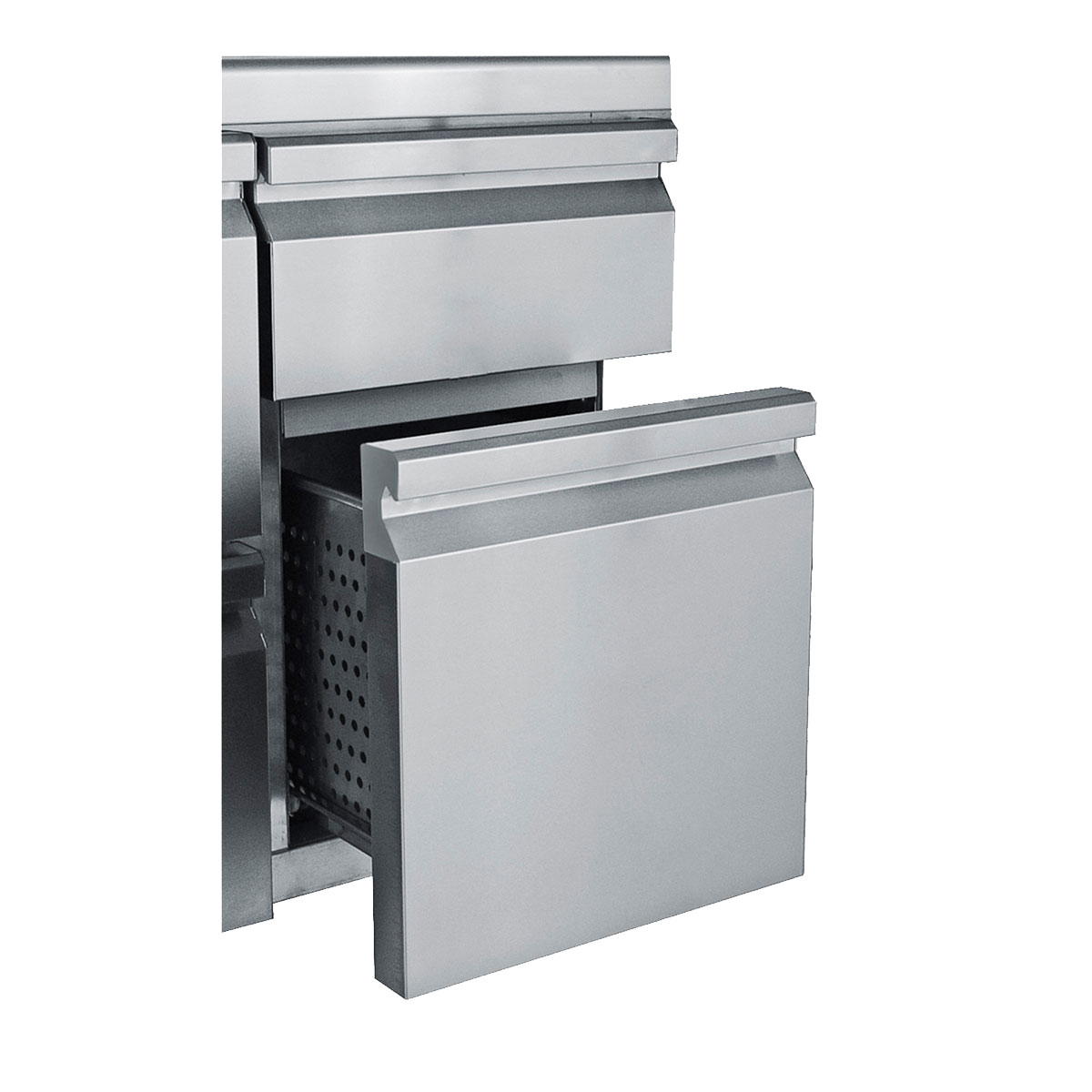 Κατασκευασμένο από ανοξείδωτο χάλυβα Μόνωση με οικολογική πολυουρεθάνη πάχους 5 cm Οδηγοί βαρέως τύπου Υγειονομικά μαγνητικά λάστιχα που αφαιρούνται εύκολα Δυνατότητα τοποθέτησης λεκανών GN μέσα στο συρτάρι