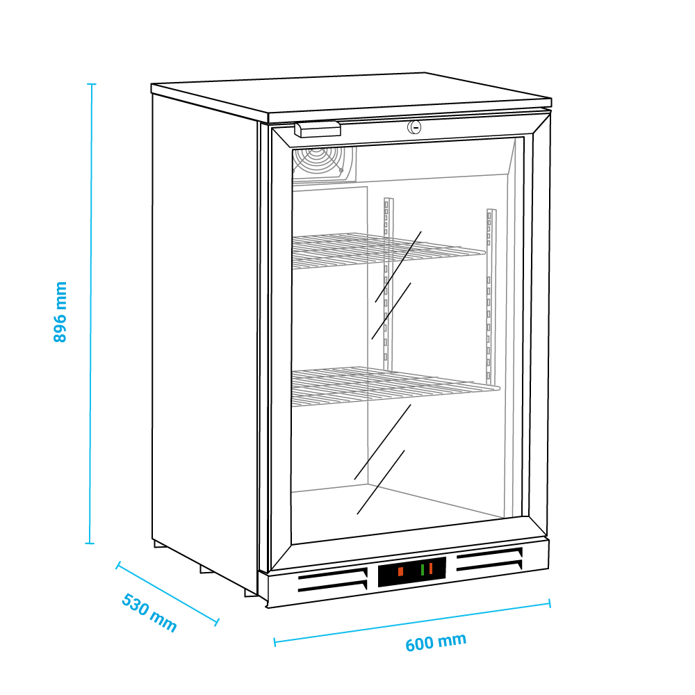 Εξωτερικές διαστάσεις 600x530x896(h)mm Εσωτερικές διαστάσεις 520x415x745(h)mm Χωρητικότητα 136 lt Θερμοκρασία +1ºC / +10οC Ισχύς 160 Watt, 230V / 50Hz Ψύξη Βεβιασμένη Απόψυξη Αυτόματη Ψυκτικό υγρό R600a Ράφια 2 (600x352mm) Φωτισμός LED Κλιματική κλάση 4 (30°C & 55% RH) Καθαρό Βάρος 40 Kg Ανοιγόμενη πόρτα με αυτόματη επαναφορά Ηλεκτρονικός θερμοστάτης - θερμόμετρο Κλειδαριά 4 ποδαράκια