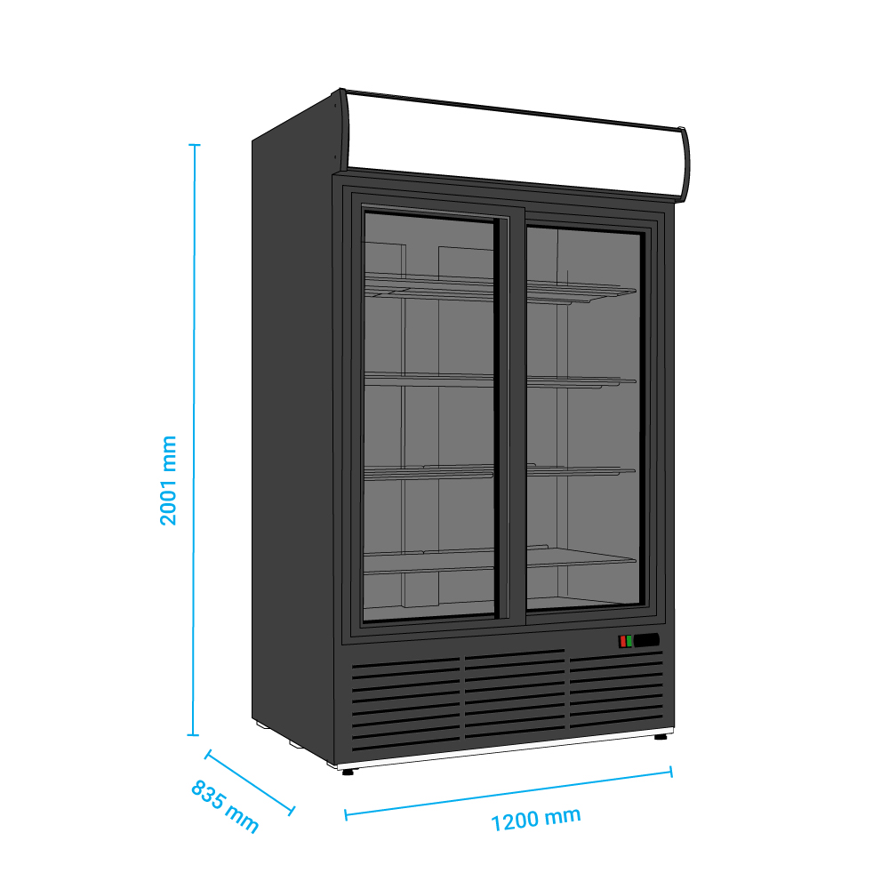 Εξωτερικές διαστάσεις 1200x835x2001(h)mm Εσωτερικές διαστάσεις 1125x641x1386(h)mm Χωρητικότητα 1230 lt Θερμοκρασία +1ºC / +10οC Ισχύς 730 Watt / 220-240V / 50 Hz Ψύξη Βεβιασμένη Απόψυξη Αυτόματη Ψυκτικό υγρό R290a Ράφια 5+5 (ρυθμιζόμενα) Φωτισμός LED (κάθετος + μετώπη) Βάρος 212 Kg 2 συρόμενες πόρτες με αυτόματη επαναφορά Ηλεκτρονικός θερμοστάτης - θερμόμετρο