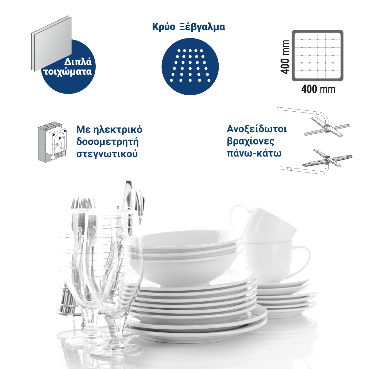 Διαστάσεις 480x520x690(h)mm Άνοιγμα πόρτας 280 mm Καλάθι 400x400 mm Κύκλος πλύσης 2 min Ισχύς 3070W / 230V / 50Hz Αντίσταση κάδου 1600 Watt Αντίσταση Boiler 2800 Watt Αντλία πλύσης 0,27 KWatt Πλύση Πάνω-κάτω Απόπλυση Πάνω-κάτω Με ηλεκτρικό δοσομετρητή στεγνωτικού Διπλά τοιχώματα Ανοξείδωτοι βραχίονες πάνω-κάτω Κρύο ξέβγαλμα Συμπεριλαμβάνονται: 2 καλάθια ποτηριών, 1 θήκη «πυραμίδα» για πιατάκια & 1 θήκη για μαχαιροπήρουνα