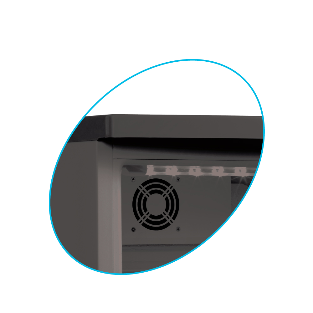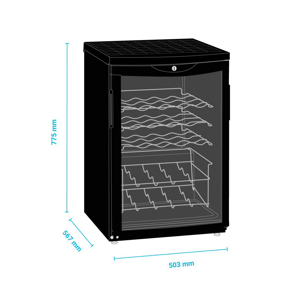Εξωτερικές διαστάσεις 503x567x775(h)mm Εσωτερικές διαστάσεις 410x415x630(h)mm Χωρητικότητα 92 Lt / 22 μπουκάλια (750ml) Θερμοκρασία +2ºC / +10 οC Ισχύς 165Watt / 220-240V / 50Hz Ψύξη Υποβοηθούμενη με ανεμιστήρα Απόψυξη Αυτόματη Ψυκτικό υγρό R600a Ράφια 4 Φωτισμός LED Κλιματική κλάση 4 (+30ºC & 55%RH) Καθαρό Βάρος 33 Kg Μηχανικός θερμοστάτης Δυνατότητα αναστροφής φοράς πόρτας 4 πόδαρακια ρυθμιζόμενα Κλειδαριά