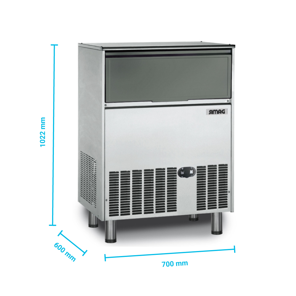 Διαστάσεις 700x600x1022(h)mm Παραγωγή σε 24h αερόψυκτη 93 kg Παγάκια ανά κύκλο 56 Ισχύς 1050 Watt Αποθηκή 50 kg Παγάκι Gourmet medium 20 gr Ψυκτικό υγρό R134a Βάρος 56 Kg