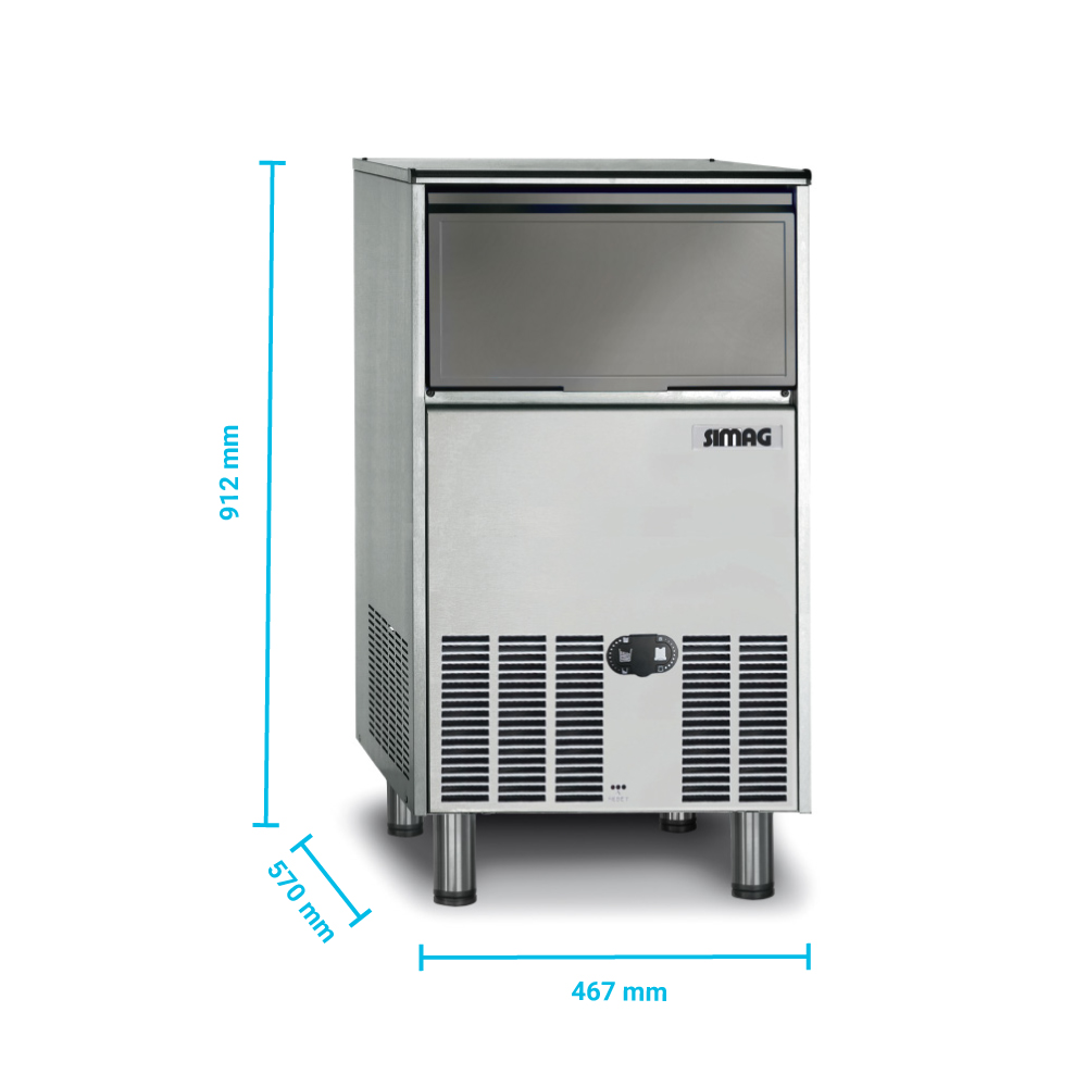 Διαστάσεις 467x570x912(h)mm Παραγωγή σε 24h αερόψυκτη 48 kg Παγάκια ανά κύκλο 32 Ισχύς 650 Watt Αποθηκή 22 kg Παγάκι Gourmet medium 20 gr Ψυκτικό υγρό R134a Βάρος 38 Kg