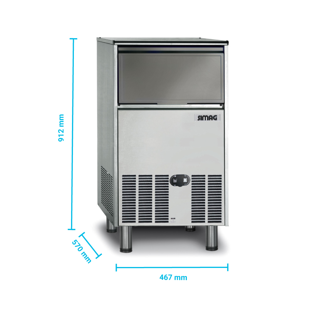 Διαστάσεις 467x570x912(h)mm Παραγωγή σε 24h αερόψυκτη 60 kg (32 παγάκια / κύκλο) Παγάκια ανά κύκλο 32 Ισχύς 650 Watt Αποθηκή 22 kg Παγάκι Gourmet medium 20 gr Ψυκτικό υγρό R134a Βάρος 39 Kg