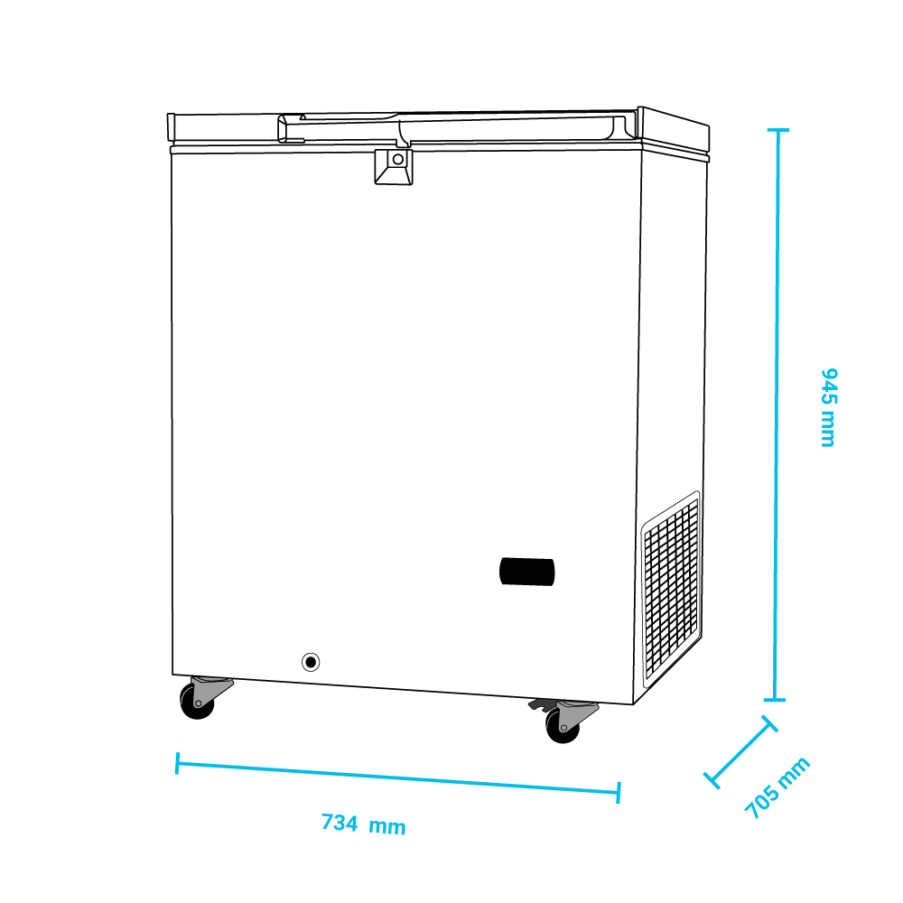 Εξωτερικές διαστάσεις 734x705x945(h)mm Εσωτερικές διαστάσεις 570x440x705(h)mm Θερμοκρασία -5 / -45οC Ισχύς 250 Watt, 220-240V / 50Hz Χωρητικότητα 155 lt Ψύξη Στατική Απόψυξη Χειροκίνητη Ψυκτικό υγρό R290 Κλιματική κλάση 3 (+25°C & 60%RH) Επιπέδο θορύβου 45 db Καθαρό Βάρος 49 Kg 4 ρόδες , οι δύο με φρένο. Ηλεκτρονικός θερμοστάτης & θερμόμετρο Χερούλι βαρέος τύπου με κλειδαριά