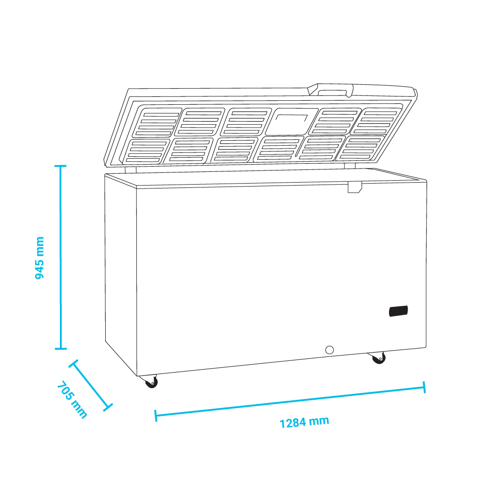 Εξωτερικές διαστάσεις 1284x705x945(h)mm Εσωτερικές διαστάσεις 1120x440x705(h)mm Θερμοκρασία -5 / -45οC Ισχύς 500 Watt, 220-240V / 50Hz Χωρητικότητα 330 lt Ψύξη Στατική Απόψυξη Χειροκίνητη Ψυκτικό υγρό R290 Κλιματική κλάση 3 (+25°C & 60%RH) Επίπεδο θορύβου 45 db Καθαρό Βάρος 71 Kg 4 ρόδες (οι 2 με φρένο) Ηλεκτρονικός θερμοστάτης & θερμόμετρο Χερούλι βαρέος τύπου με κλειδαριά
