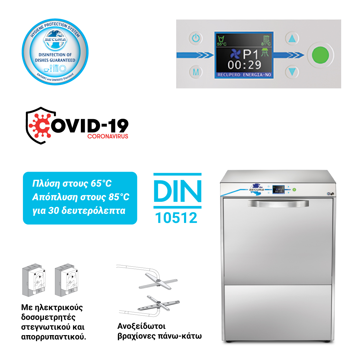Διαστάσεις 604x633x838(h) mm Καλάθι 500x500 mm Κύκλοι πλύσης Secura system 6 κύκλοι Άνοιγμα πόρτας 400 mm Αριθμός καλαθιών 1 Ισχύς 8050W / 400V / 3ph / 50Hz Χωρητικότητα κάδου 11 lt Αντλία πλύσης 0.55 Kw Αντίσταση κάδου 2000W Αντίσταση boiler 7500W ΤΕΧΝΙΚΕΣ ΠΛΗΡΟΦΟΡΙΕΣ • Ξεχωριστό κύκλωμα πλύσης και απόπλυσης για αποφυγή μόλυνσης • Σύστημα SOFT START με προοδευτική εκκίνηση της αντλίας πλύσης • Ηλεκτρονικός πίνακας ελέγχου με έγχρωμη οθόνη TFT 45x60 mm υψηλής ανάλυσης με άμεση απεικόνιση θερμοκρασιών, φάσεων επεξεργασίας και τυχόν ανωμαλιών. • Δύο επίπεδα μενού: ένα για τον χρήστη (user) και ένα για τον τεχνικό (service) με κωδικό. Ανοξείδωτοι βραχίονες πάνω-κάτω Πλύση στους 65°C & Απόπλυση στους 85°C για 30 δευτερόλεπτα Με αντλία εξισορρόπησης πίεσης.