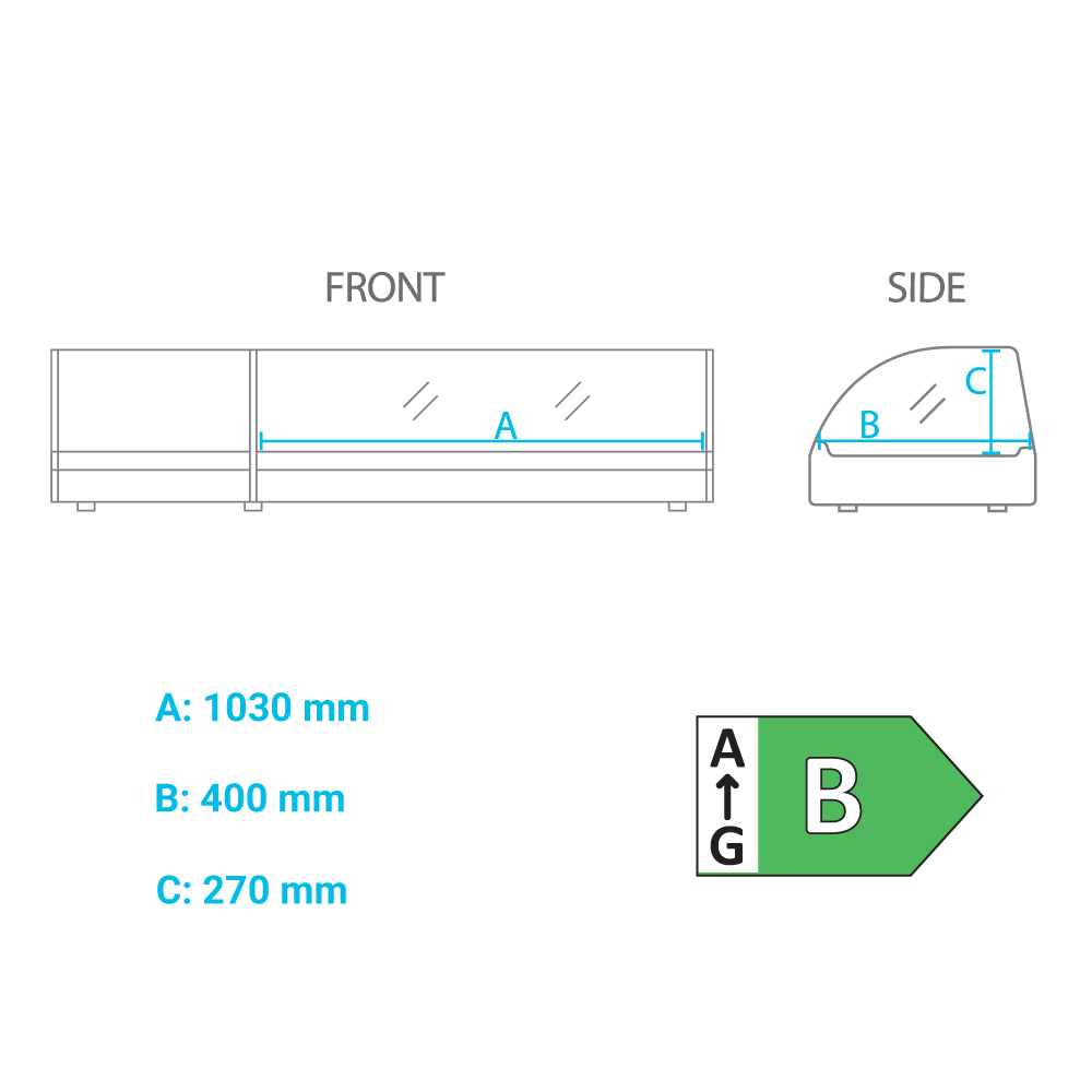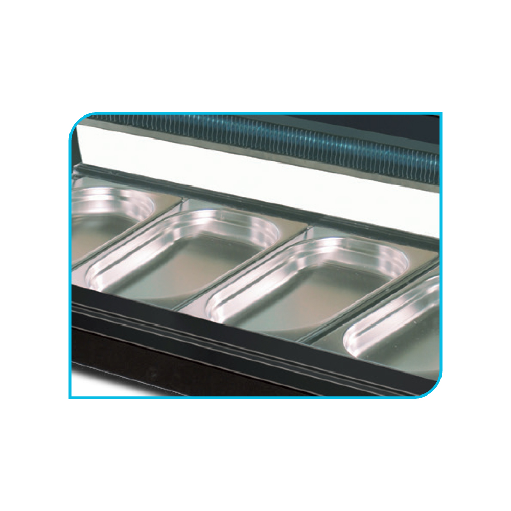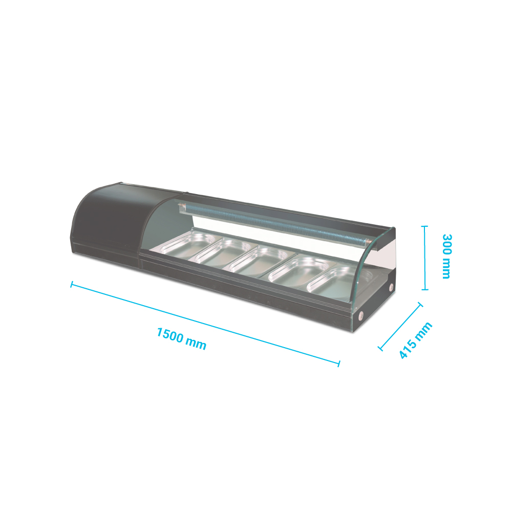 Εξωτερικές διαστάσεις 1500x415x300(h)mm Χωρητικότητα 5 GN 1/3 Θερμοκρασία +1º / +6ºC Ισχύς 160Watt /230V / 50Hz Ψύξη Στατική Απόψυξη Χειροκίνητη Φωτισμός LED Ψυκτικό υγρo R600 Βάρος 71 Kg Ηλεκτρονικός θερμοστάτης 6 ποδαράκια